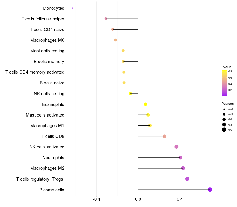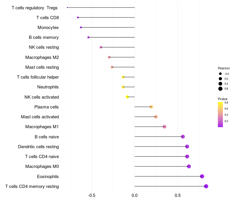 Lollipop of SULF1 expression and immune infiltrating cell level correlation result in HBV+ Liver cirrhosis samples