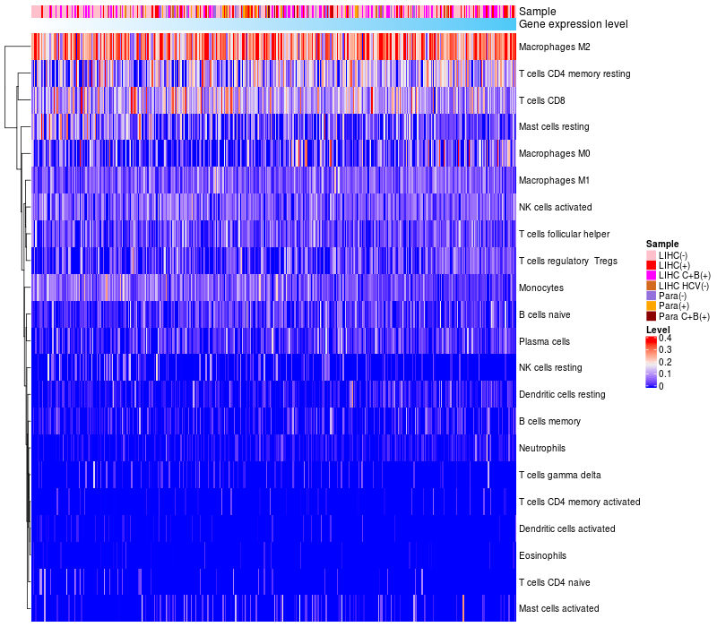 Liver hepatocellular carcinoma HCV (HBV+)(86), Liver hepatocellular carcinoma HCV (HBV-)(19), Liver hepatocellular carcinoma (HBV+)(209), Liver hepatocellular carcinoma (HBV+)(60), Paracancerous HCV (HBV+)(4), Paracancerous (HBV-)(28), Paracancerous (HBV+)(18) |