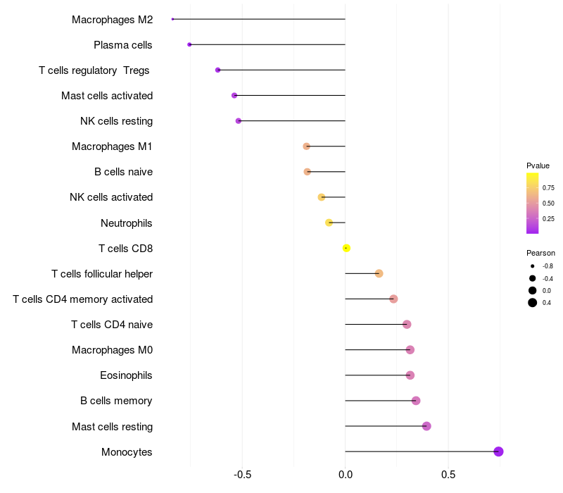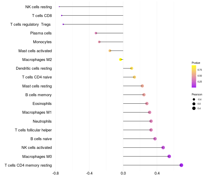Lollipop of SUMF1 expression and immune infiltrating cell level correlation result in HBV+ Liver cirrhosis samples