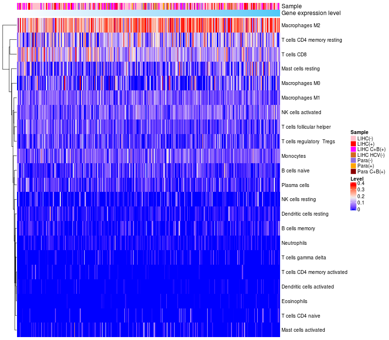 Liver hepatocellular carcinoma HCV (HBV+)(86), Liver hepatocellular carcinoma HCV (HBV-)(19), Liver hepatocellular carcinoma (HBV+)(209), Liver hepatocellular carcinoma (HBV+)(60), Paracancerous HCV (HBV+)(4), Paracancerous (HBV-)(28), Paracancerous (HBV+)(18) |