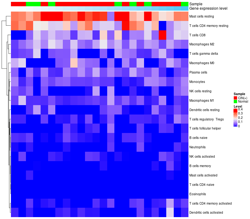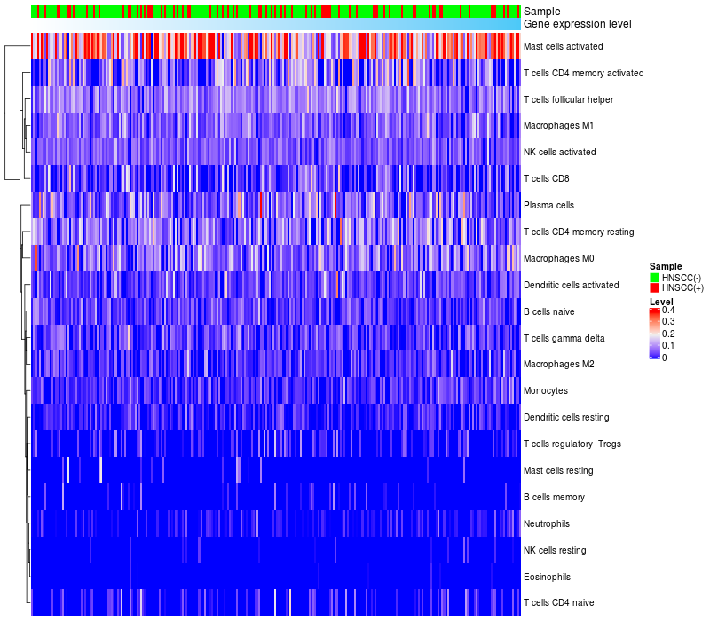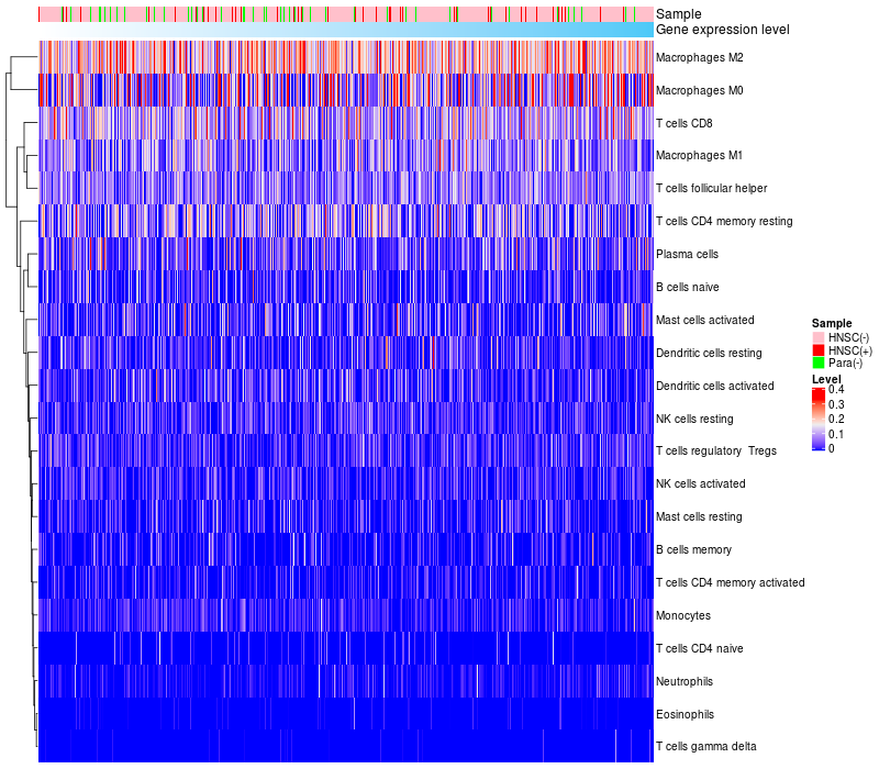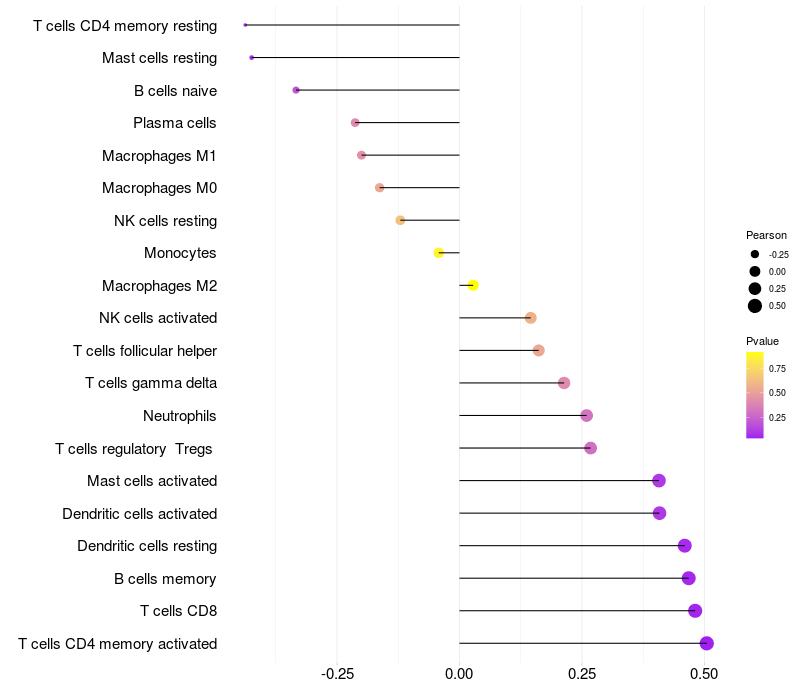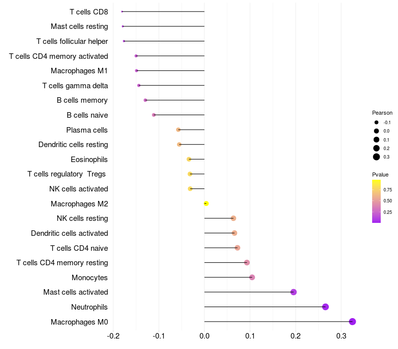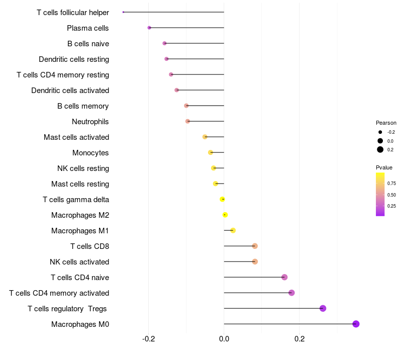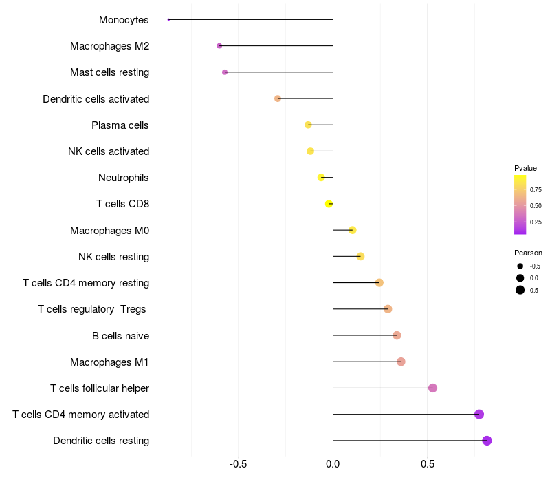 Lollipop of SUMO1P1 expression and immune infiltrating cell level correlation result in HPV+ samples