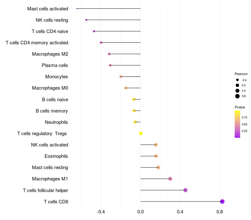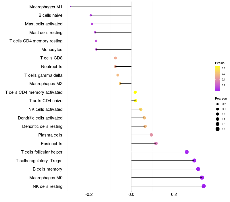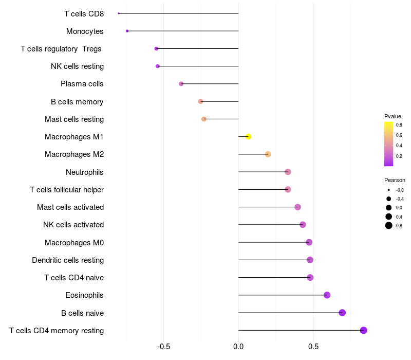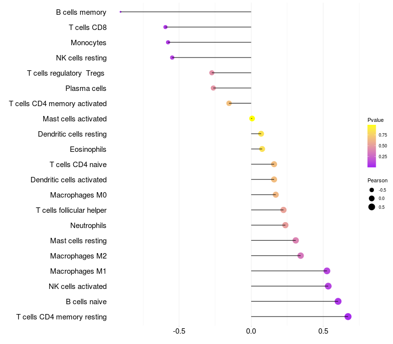 Lollipop of SUPT5H expression and immune infiltrating cell level correlation result in HBV+ Liver cirrhosis samples