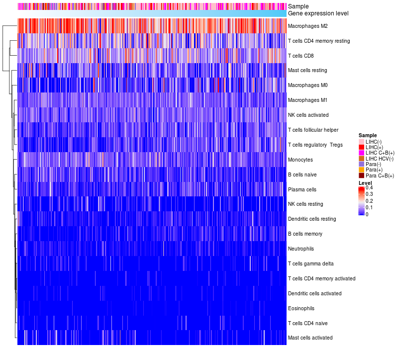 Liver hepatocellular carcinoma HCV (HBV+)(86), Liver hepatocellular carcinoma HCV (HBV-)(19), Liver hepatocellular carcinoma (HBV+)(209), Liver hepatocellular carcinoma (HBV+)(60), Paracancerous HCV (HBV+)(4), Paracancerous (HBV-)(28), Paracancerous (HBV+)(18) |
