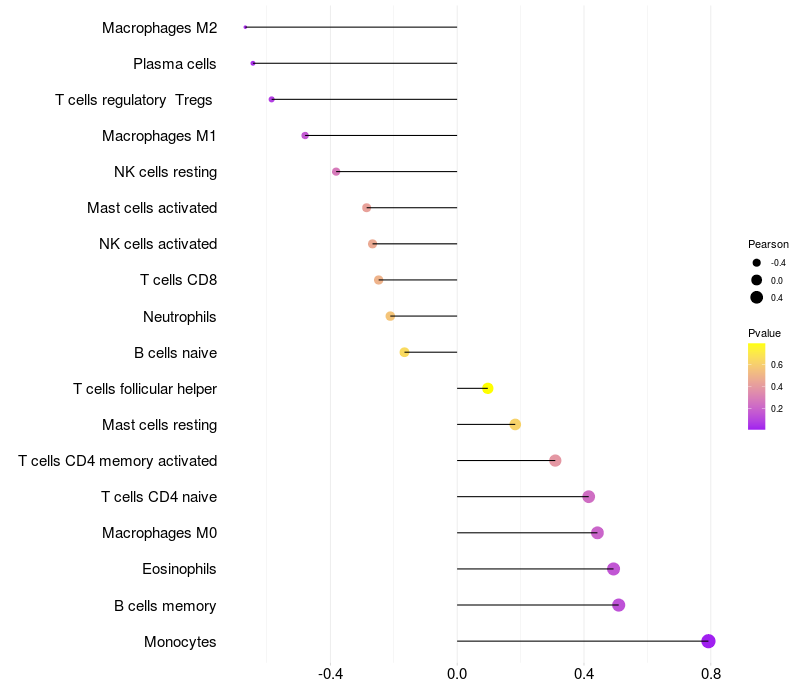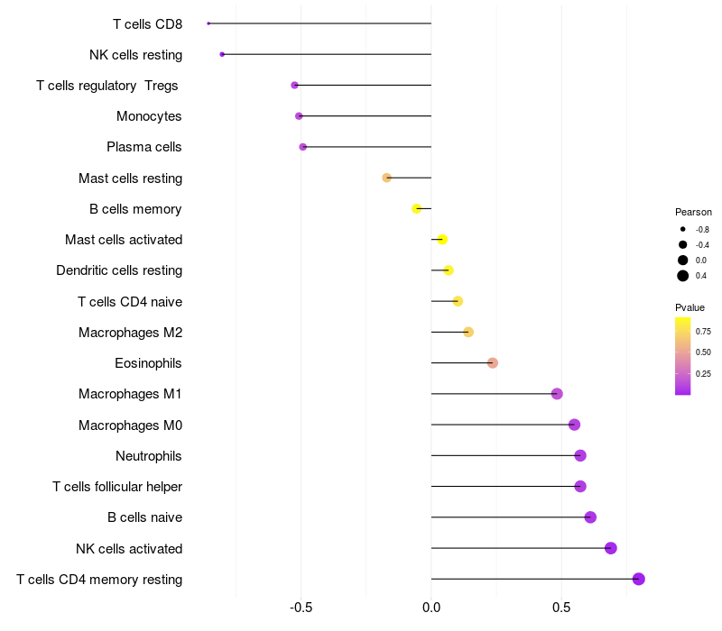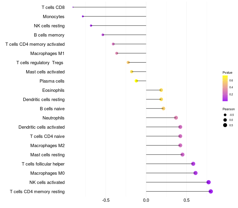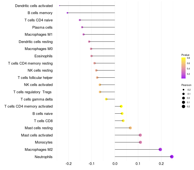 Lollipop of SURF4 expression and immune infiltrating cell level correlation result in HBV+ Liver cirrhosis samples