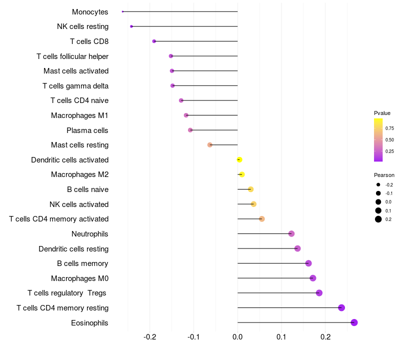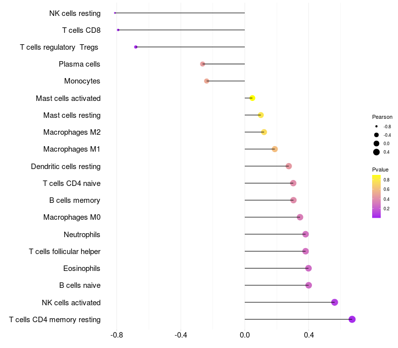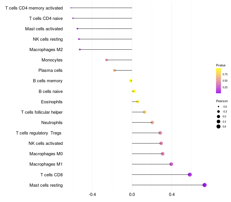 Lollipop of SWAP70 expression and immune infiltrating cell level correlation result in HBV+ Liver cirrhosis samples