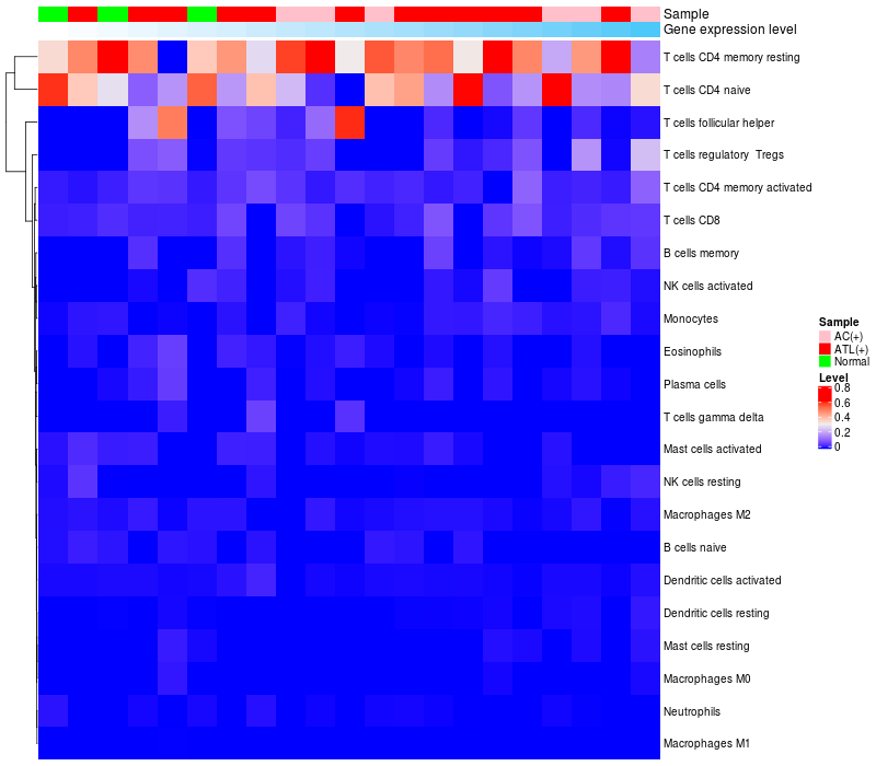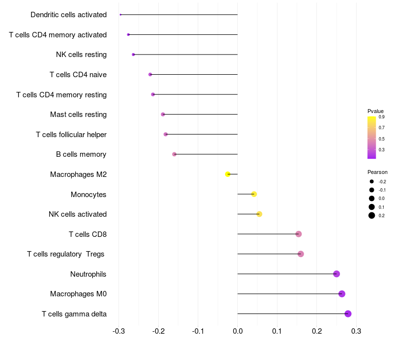 Lollipop of SYPL2 expression and immune infiltrating cell level correlation result in HTLV1+ samples