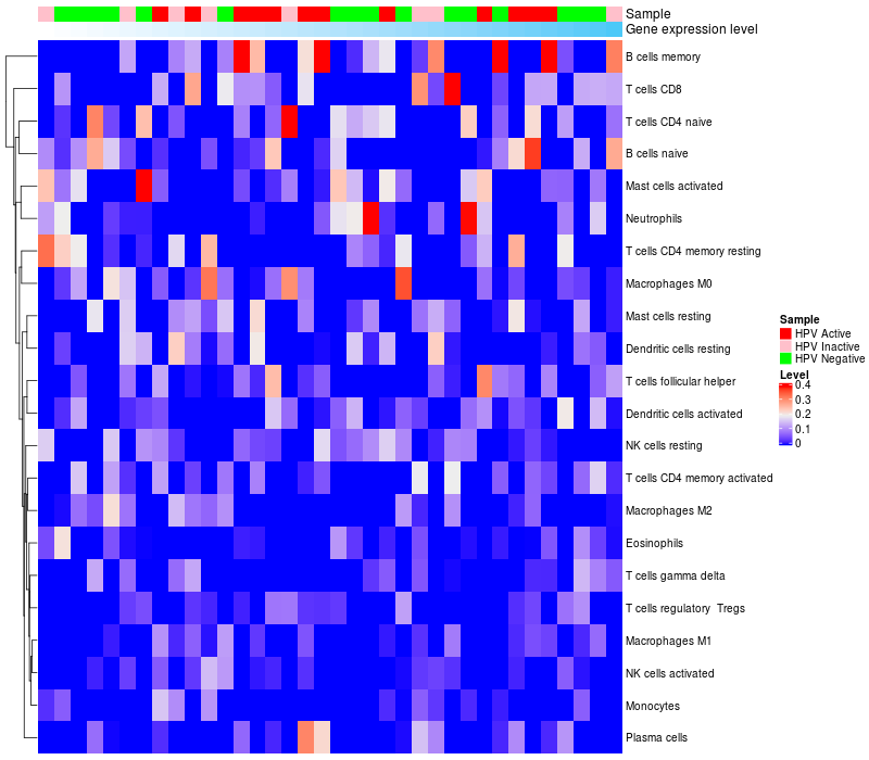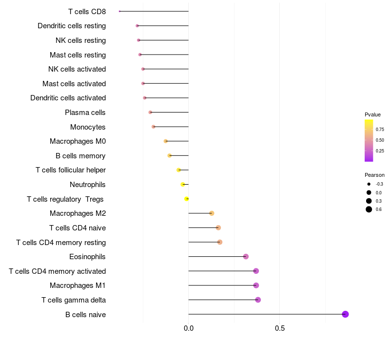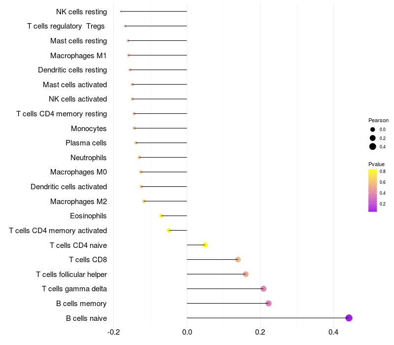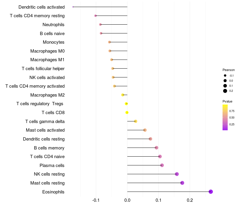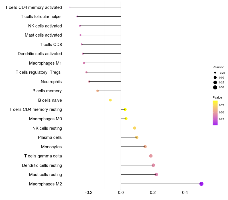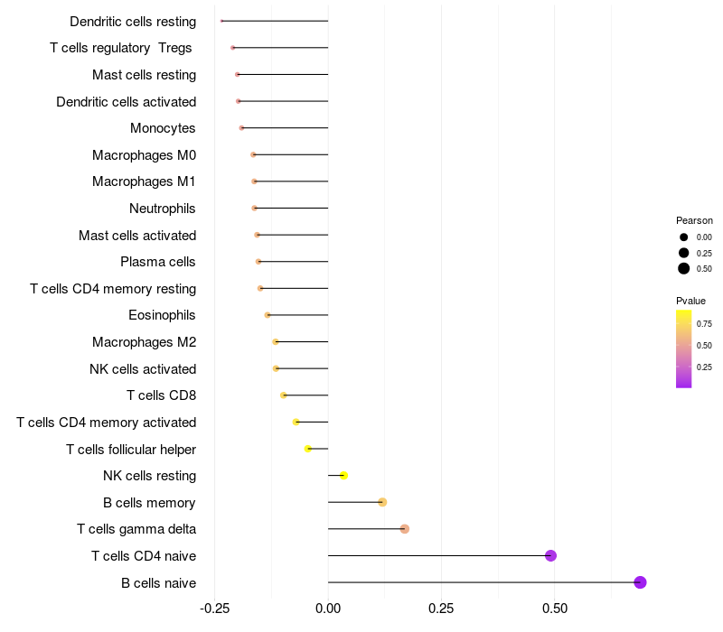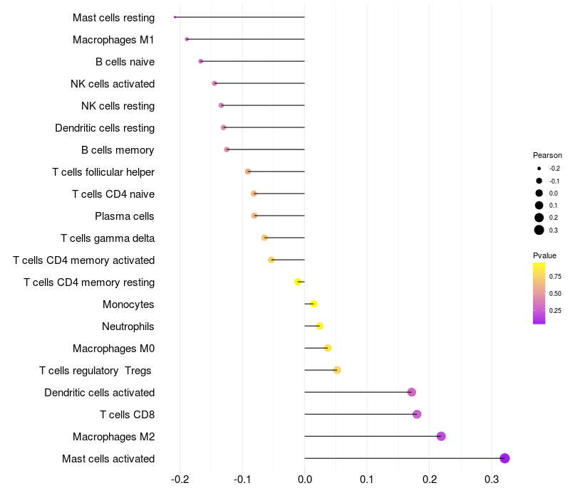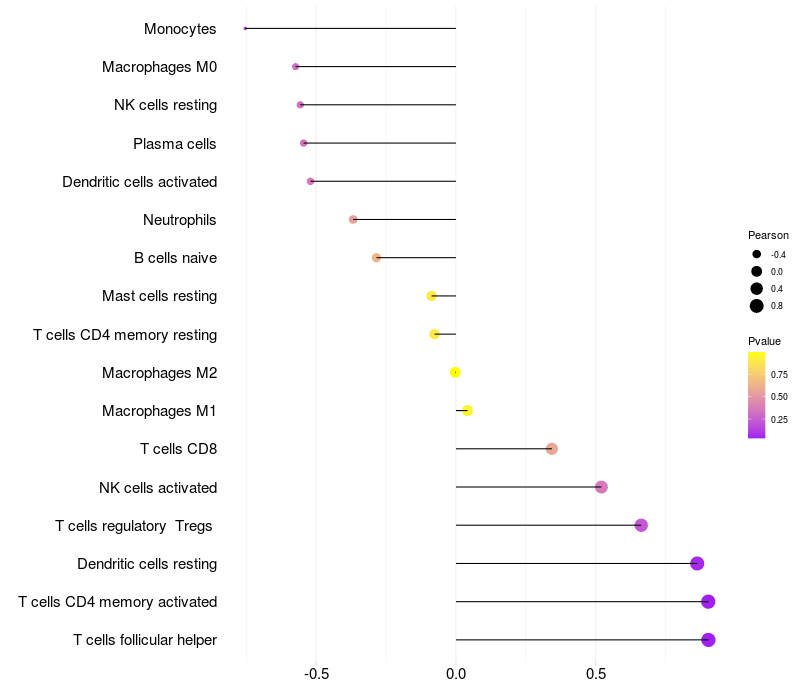 Lollipop of SYT16 expression and immune infiltrating cell level correlation result in HPV+ samples