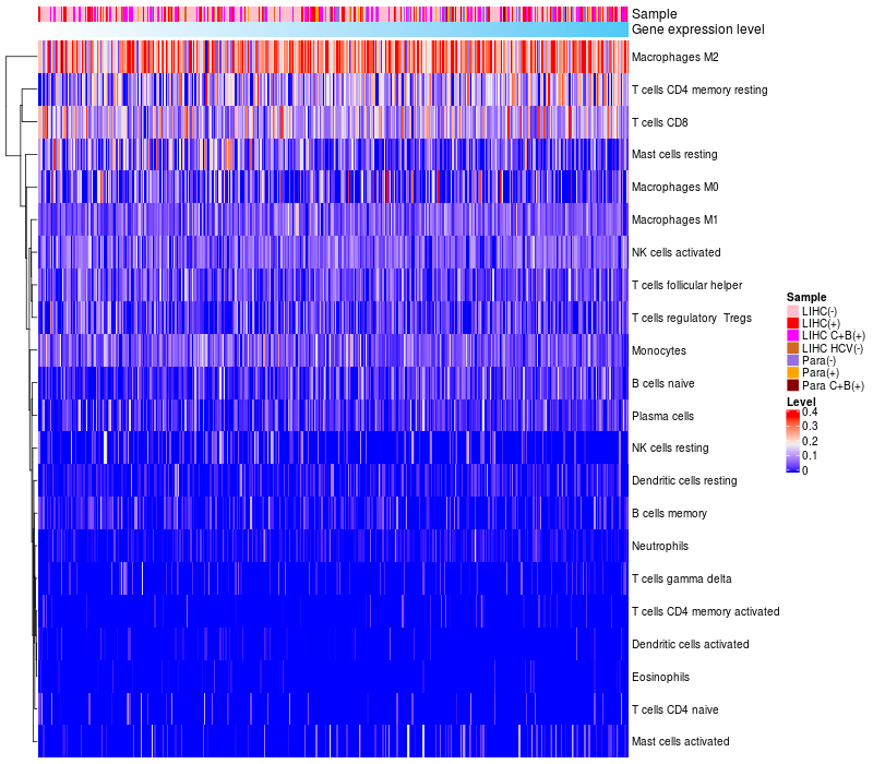 Liver hepatocellular carcinoma HCV (HBV+)(86), Liver hepatocellular carcinoma HCV (HBV-)(19), Liver hepatocellular carcinoma (HBV+)(209), Liver hepatocellular carcinoma (HBV+)(60), Paracancerous HCV (HBV+)(4), Paracancerous (HBV-)(28), Paracancerous (HBV+)(18) |