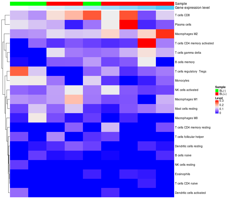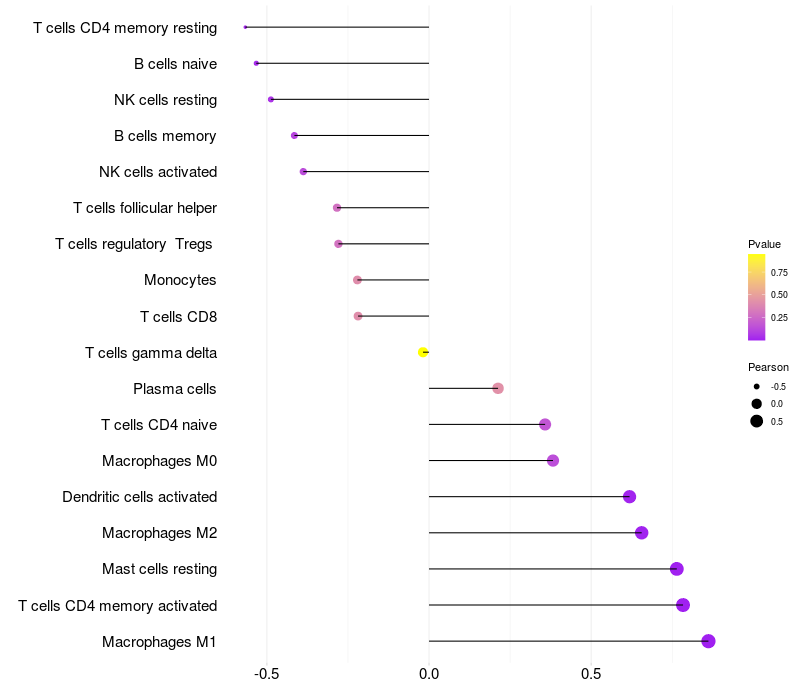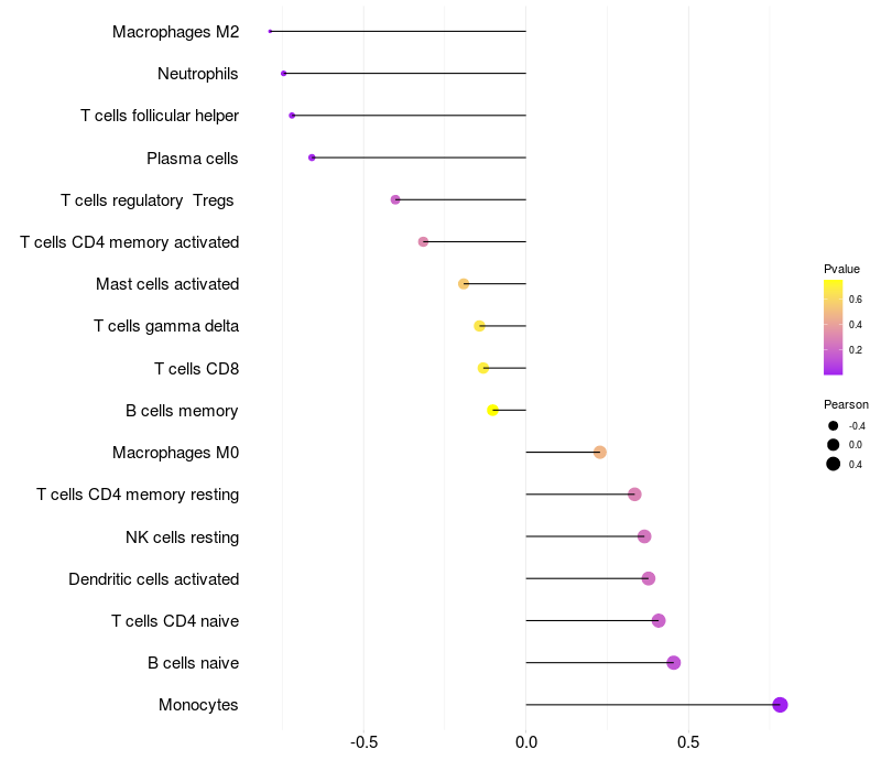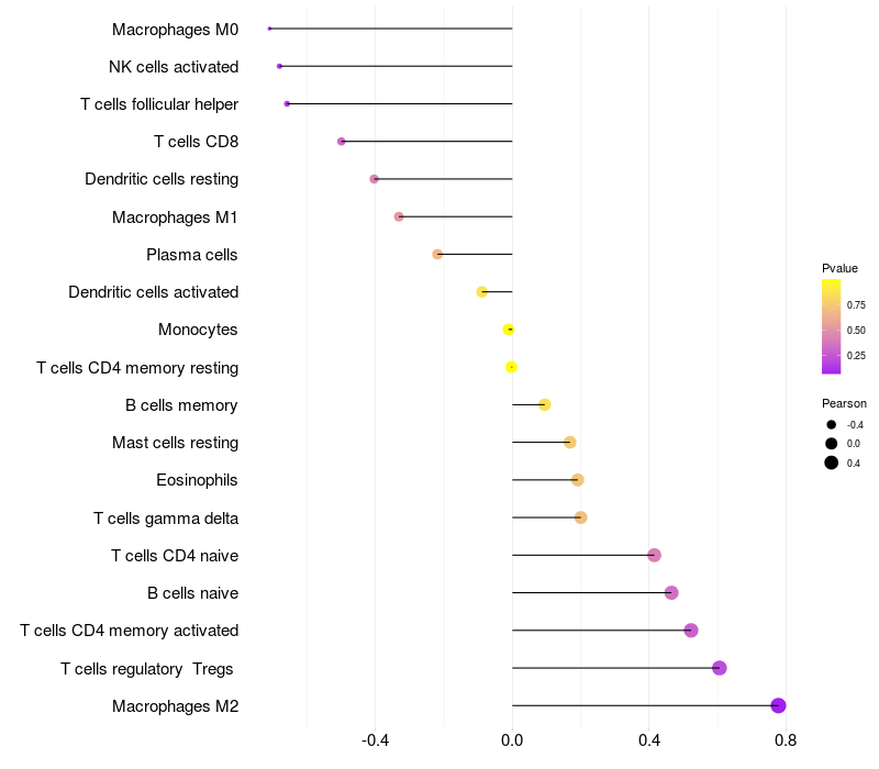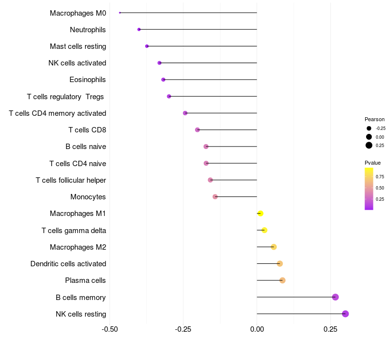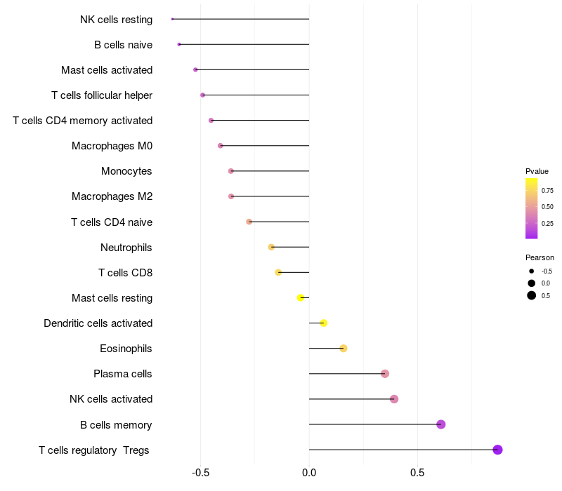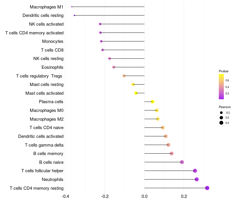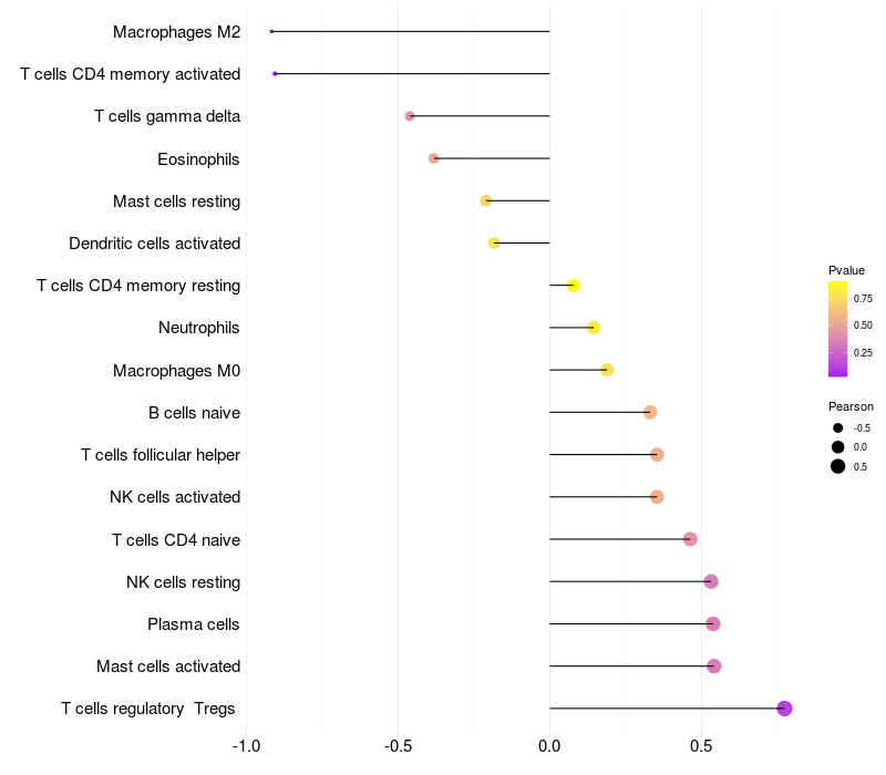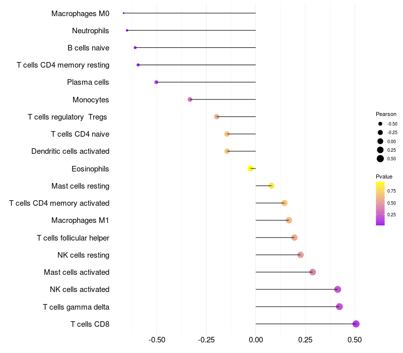 Lollipop of TAOK3 expression and immune infiltrating cell level correlation result in EBV+ samples