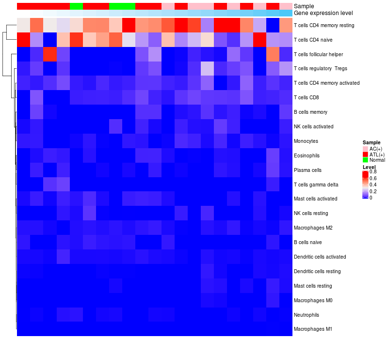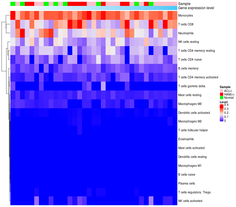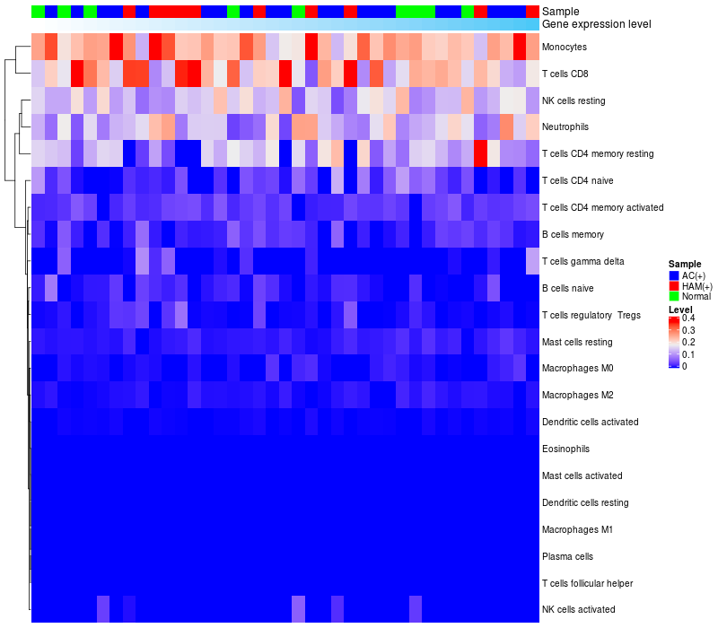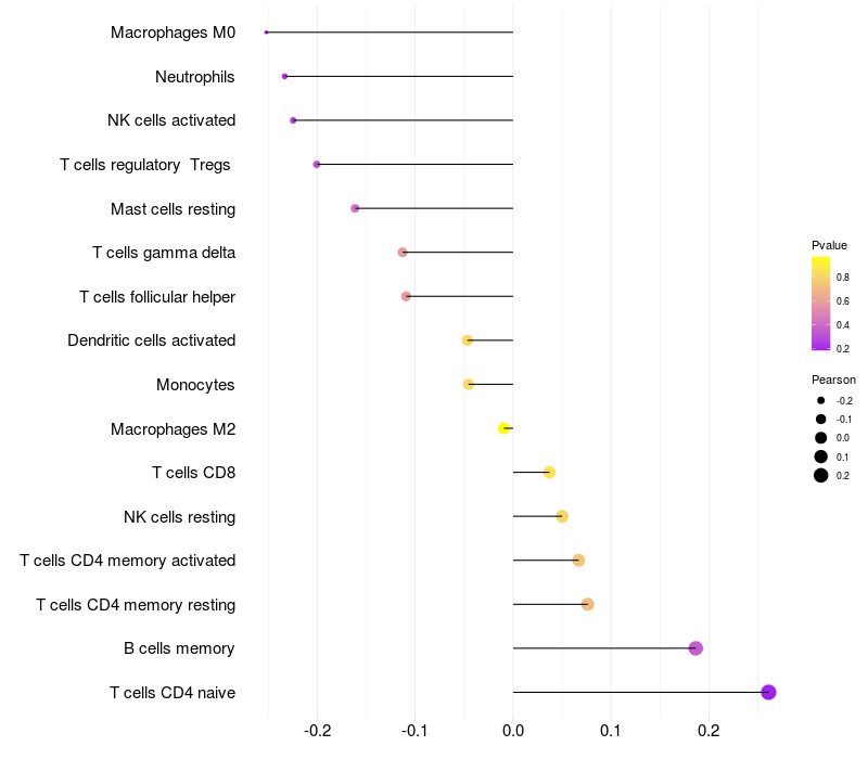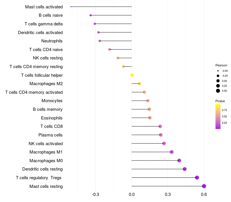 Lollipop of TBC1D22B expression and immune infiltrating cell level correlation result in HTLV1+ samples