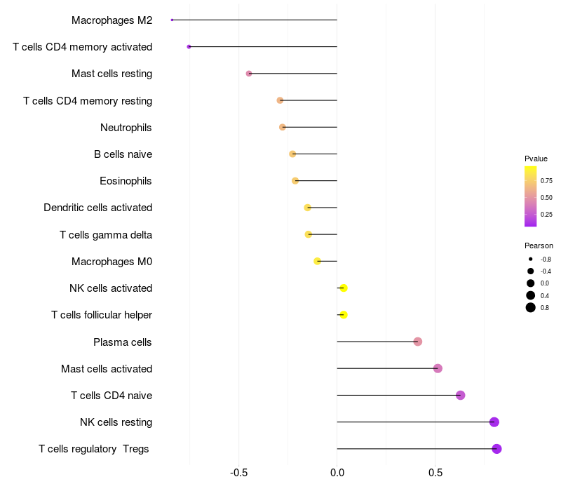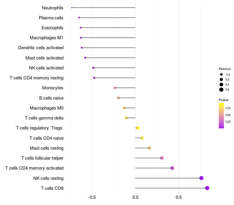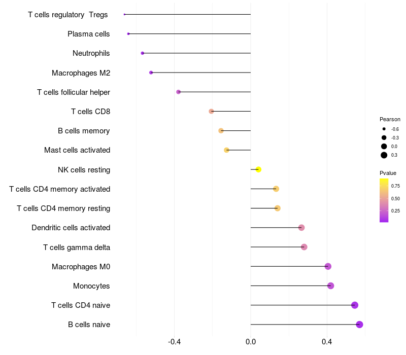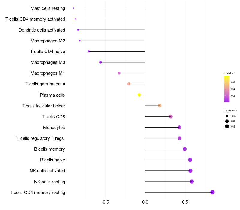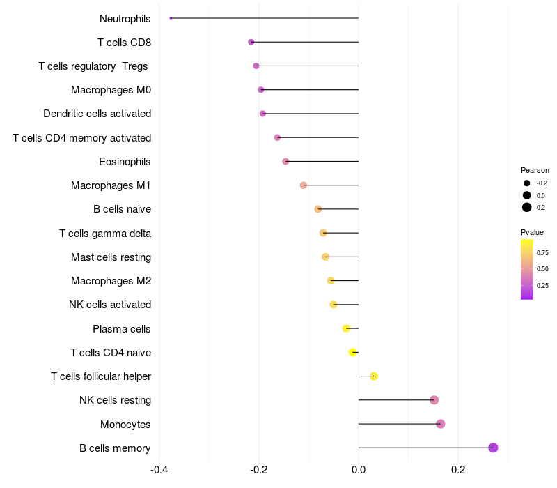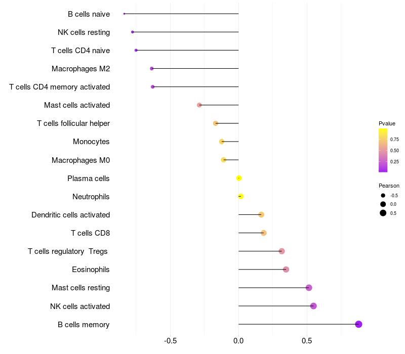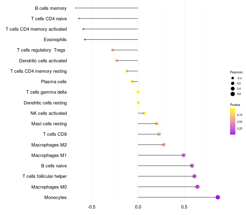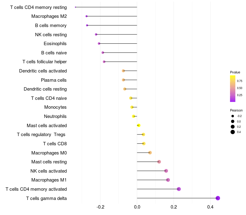 Lollipop of TBC1D2B expression and immune infiltrating cell level correlation result in EBV+ samples