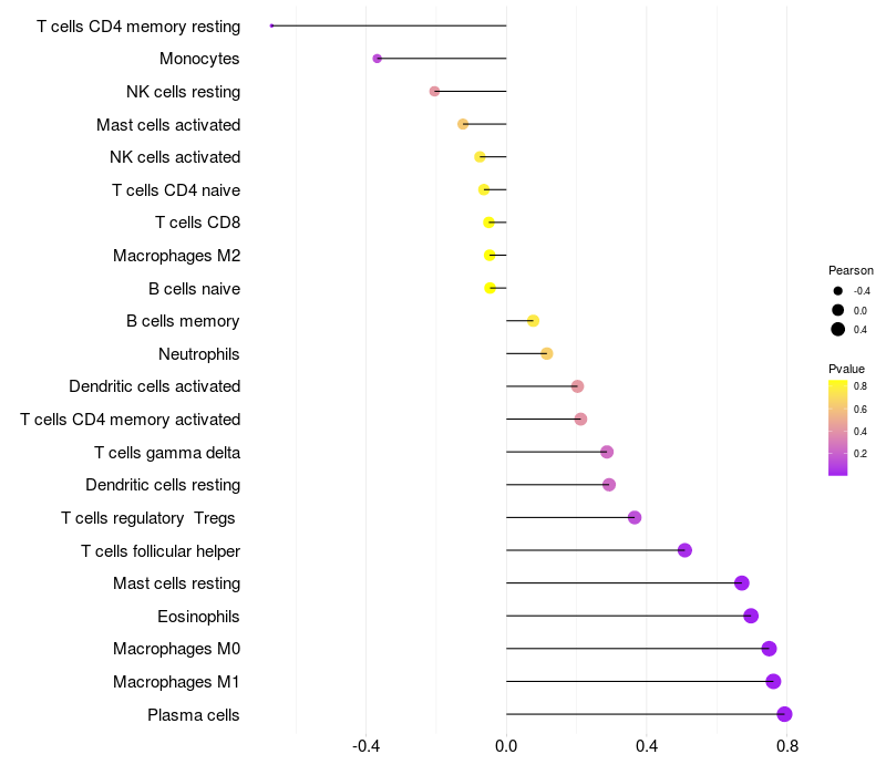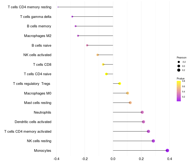 Lollipop of TBC1D8 expression and immune infiltrating cell level correlation result in HTLV1+ samples