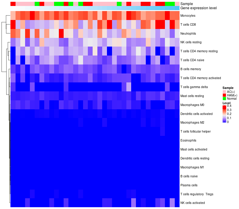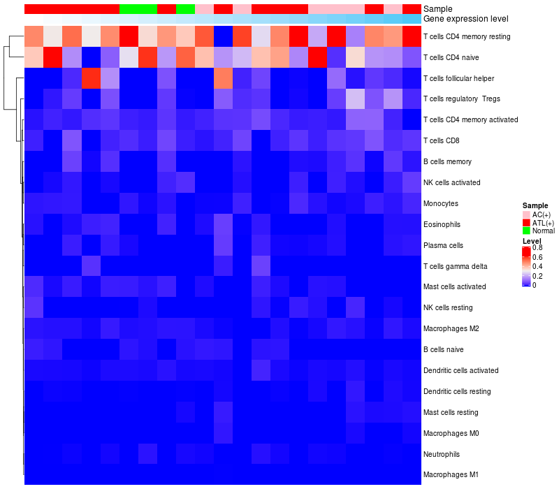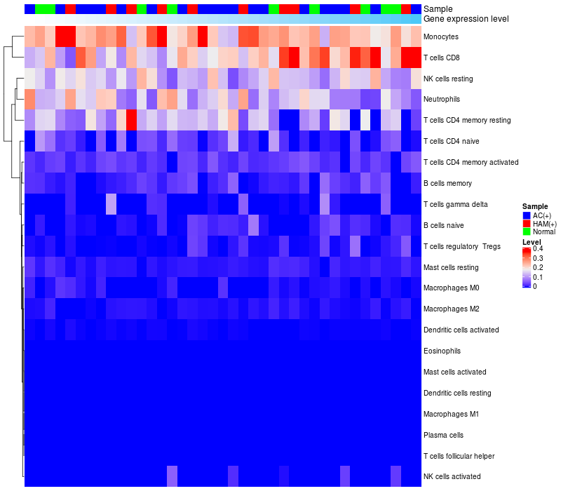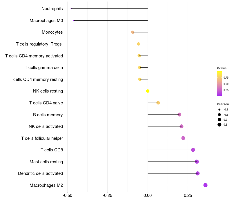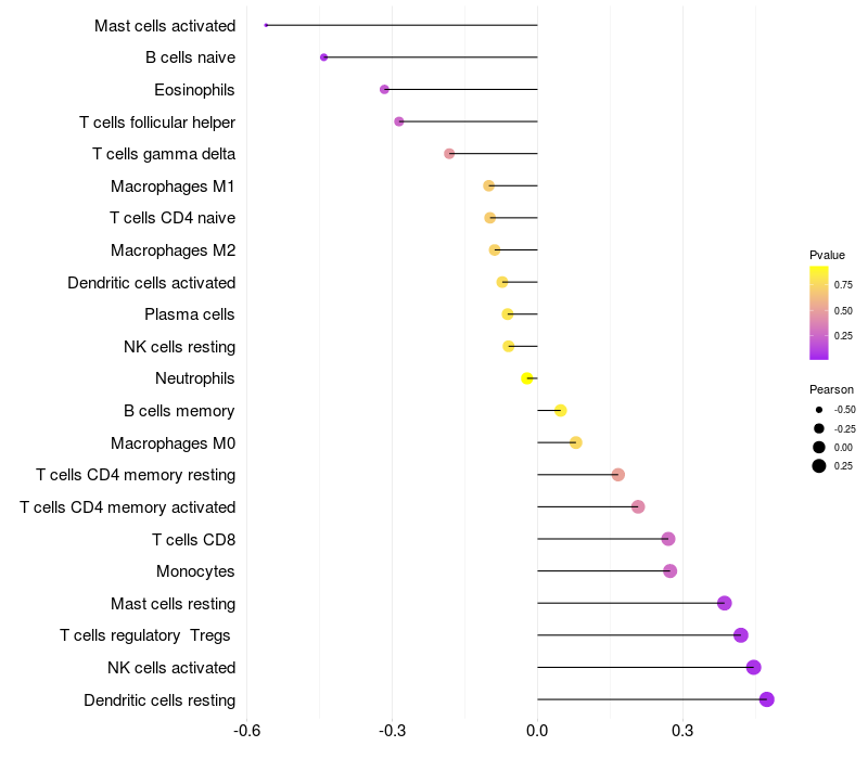 Lollipop of TBC1D9B expression and immune infiltrating cell level correlation result in HTLV1+ samples