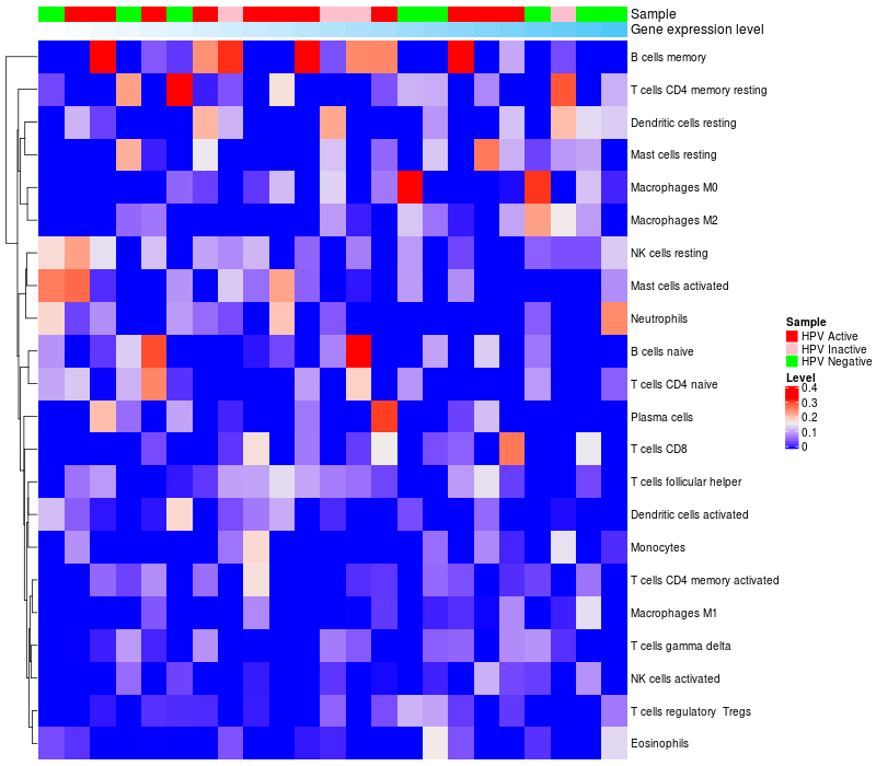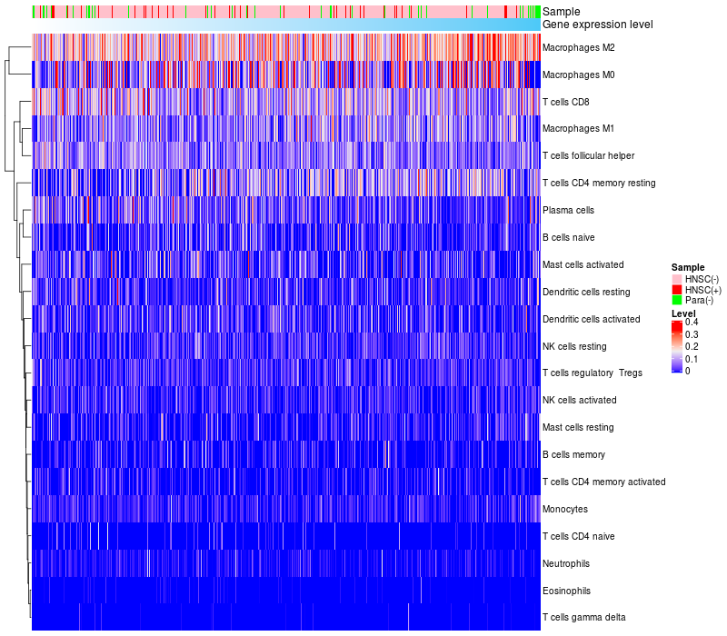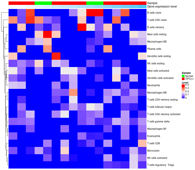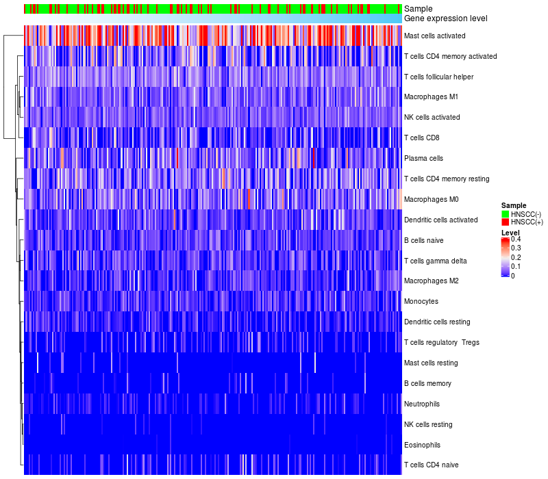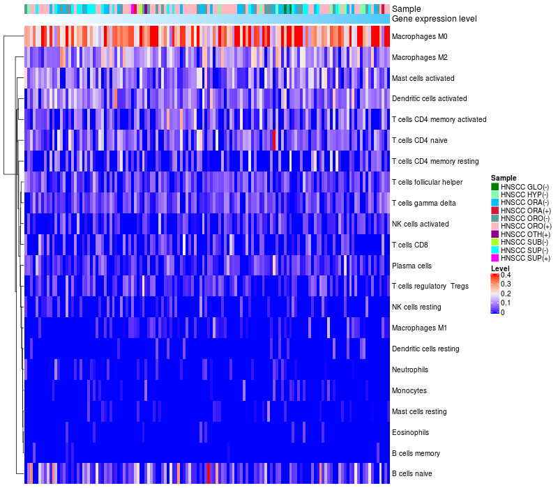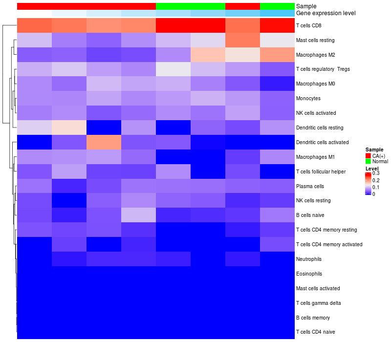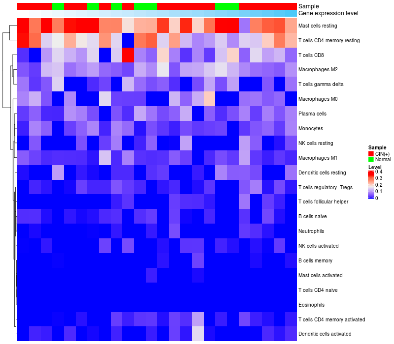• Left: Heatmap of target gene expression and the level of various types of immune cells (cell type fractions) in all samples based on CIBERSORT method.