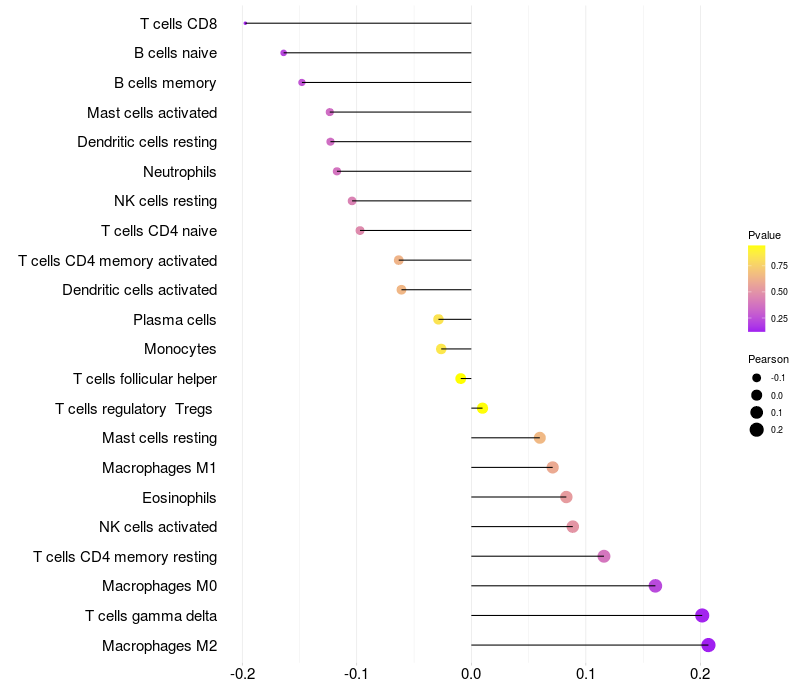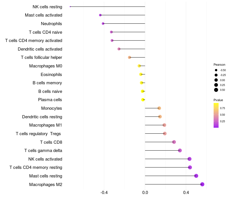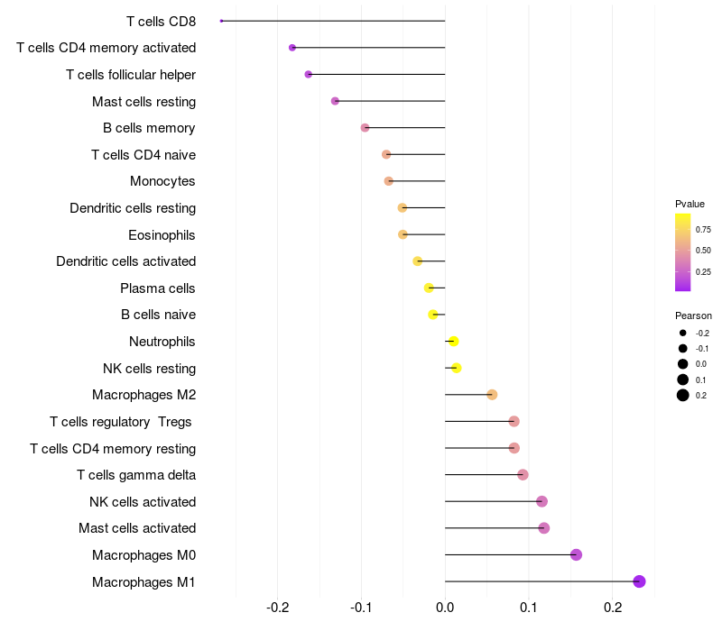 • Right: Correlation of target gene expression and the level of various types of immune cells in virus positive samples (Pearson Correlation Coefficient).