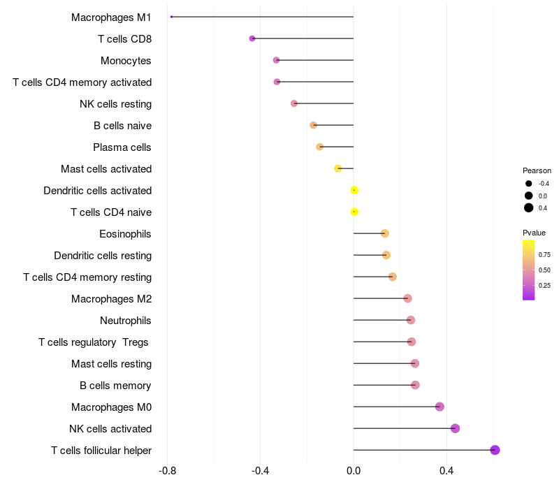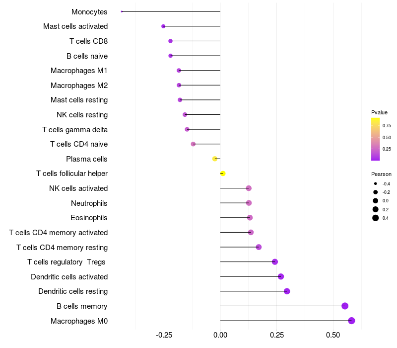 Lollipop of TCERG1 expression and immune infiltrating cell level correlation result in HBV+ Liver cirrhosis samples
