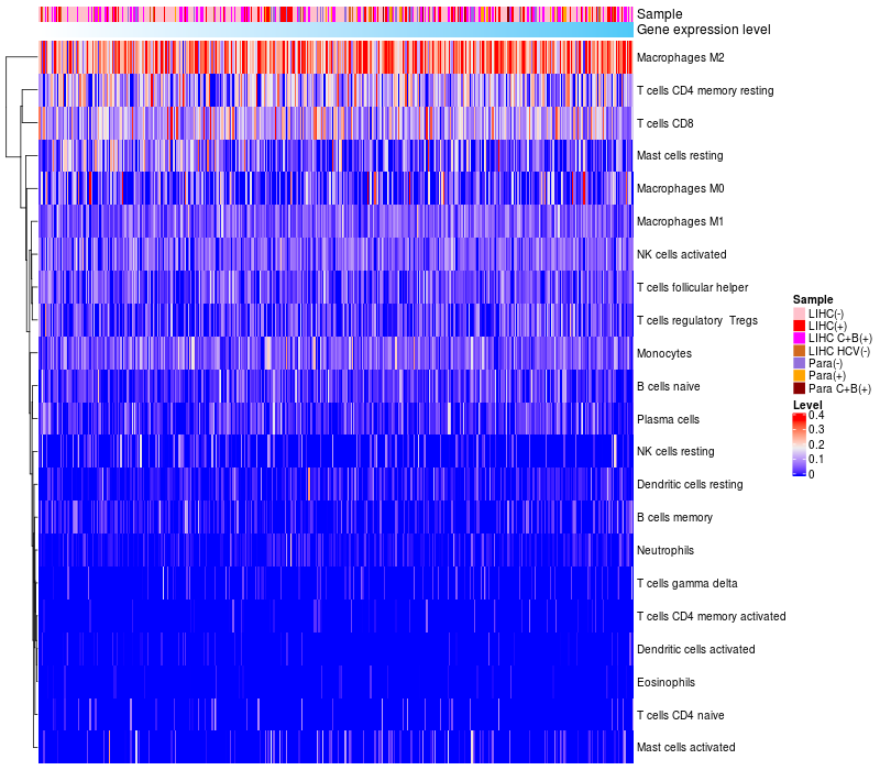 Liver hepatocellular carcinoma HCV (HBV+)(86), Liver hepatocellular carcinoma HCV (HBV-)(19), Liver hepatocellular carcinoma (HBV+)(209), Liver hepatocellular carcinoma (HBV+)(60), Paracancerous HCV (HBV+)(4), Paracancerous (HBV-)(28), Paracancerous (HBV+)(18) |