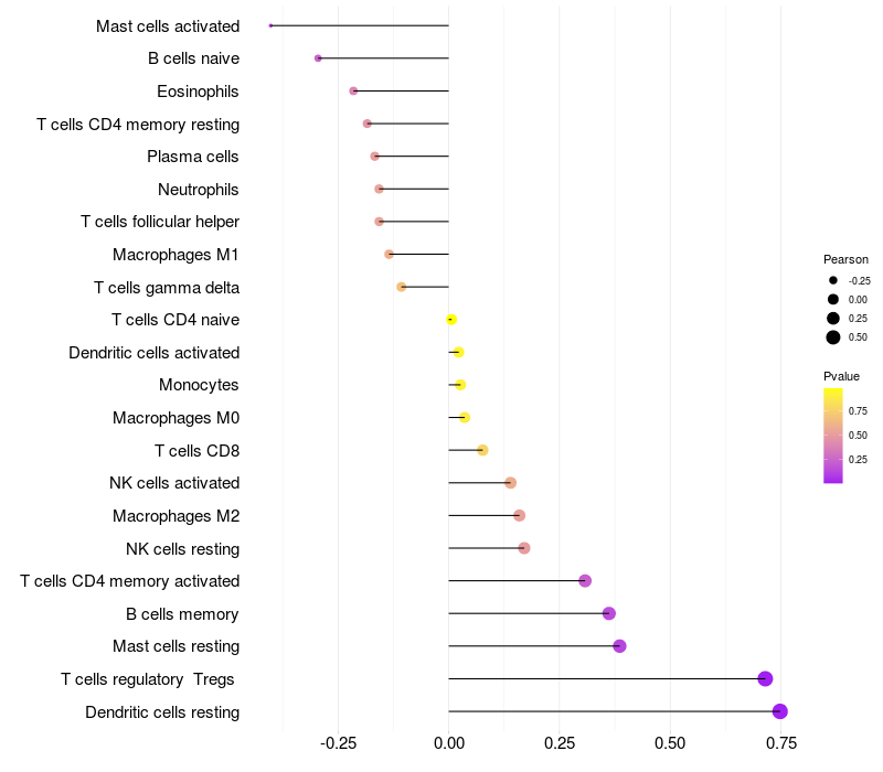Lollipop of TDRD5 expression and immune infiltrating cell level correlation result in HTLV1+ samples