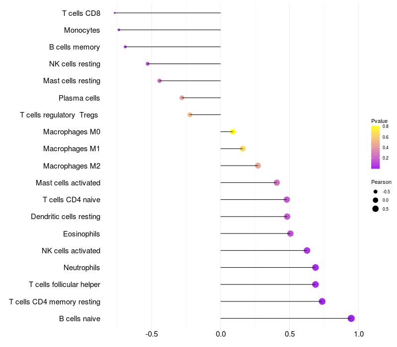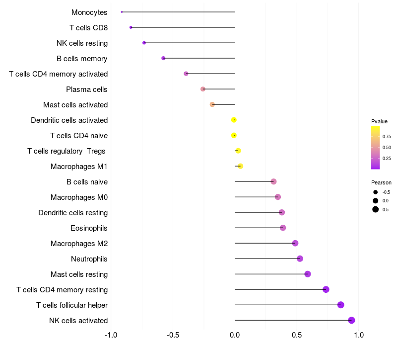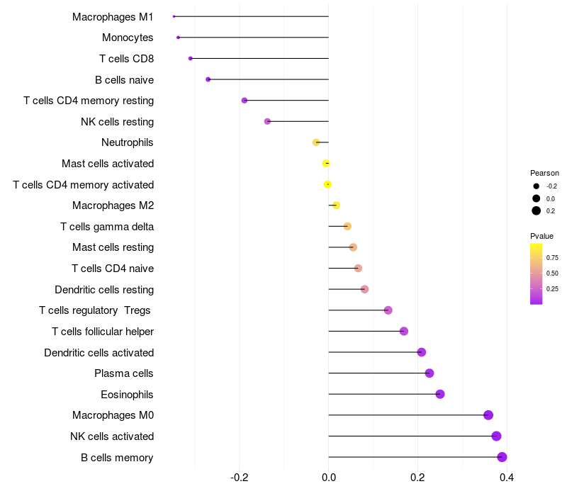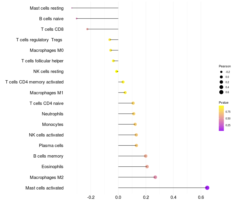 Lollipop of TEAD4 expression and immune infiltrating cell level correlation result in HBV+ Liver cirrhosis samples