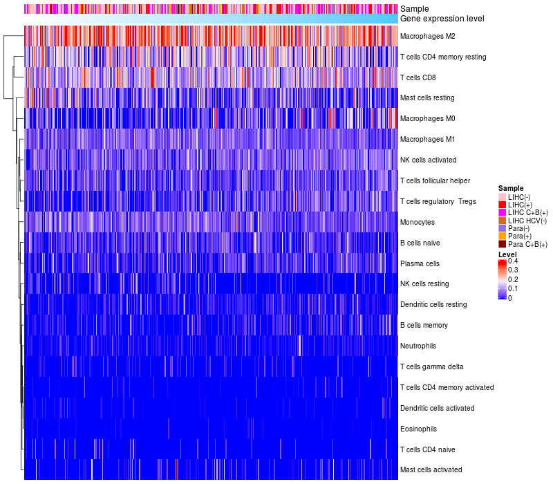 Liver hepatocellular carcinoma HCV (HBV+)(86), Liver hepatocellular carcinoma HCV (HBV-)(19), Liver hepatocellular carcinoma (HBV+)(209), Liver hepatocellular carcinoma (HBV+)(60), Paracancerous HCV (HBV+)(4), Paracancerous (HBV-)(28), Paracancerous (HBV+)(18) |