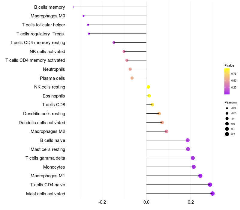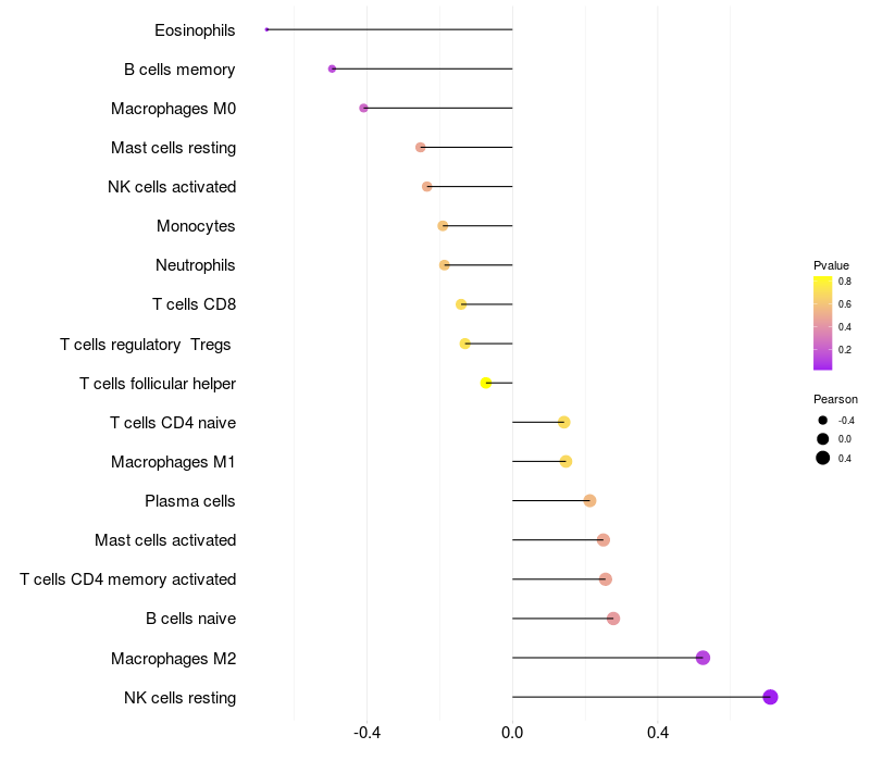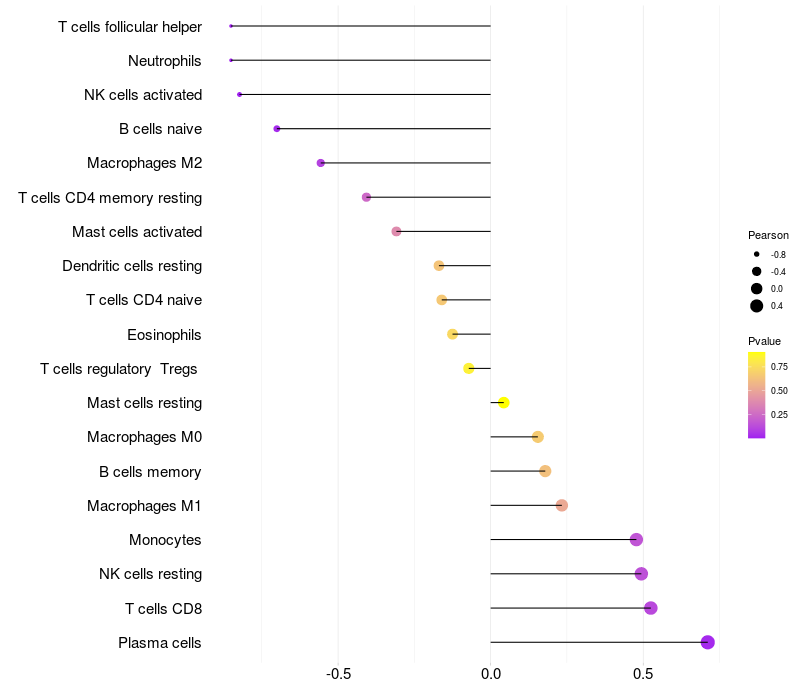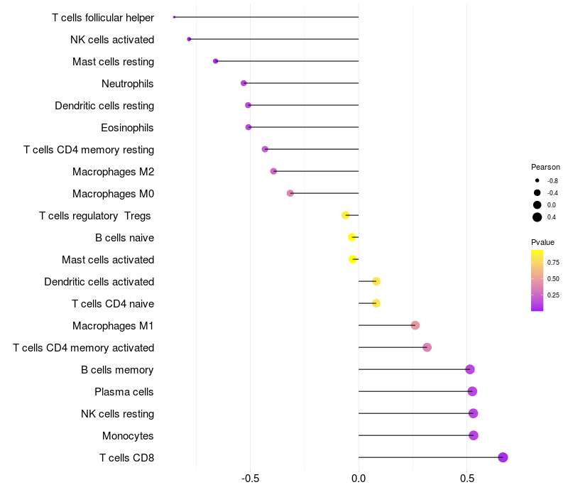 Lollipop of TEC expression and immune infiltrating cell level correlation result in HBV+ Liver cirrhosis samples