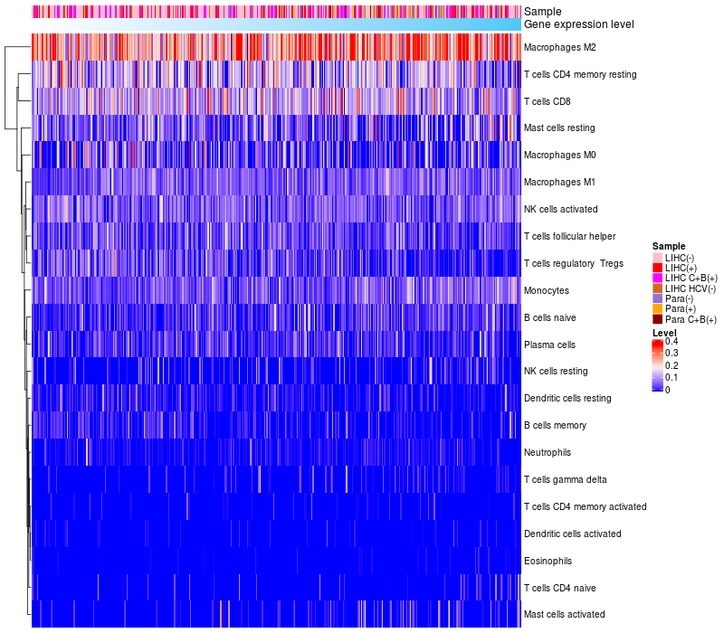 Liver hepatocellular carcinoma HCV (HBV+)(86), Liver hepatocellular carcinoma HCV (HBV-)(19), Liver hepatocellular carcinoma (HBV+)(209), Liver hepatocellular carcinoma (HBV+)(60), Paracancerous HCV (HBV+)(4), Paracancerous (HBV-)(28), Paracancerous (HBV+)(18) |