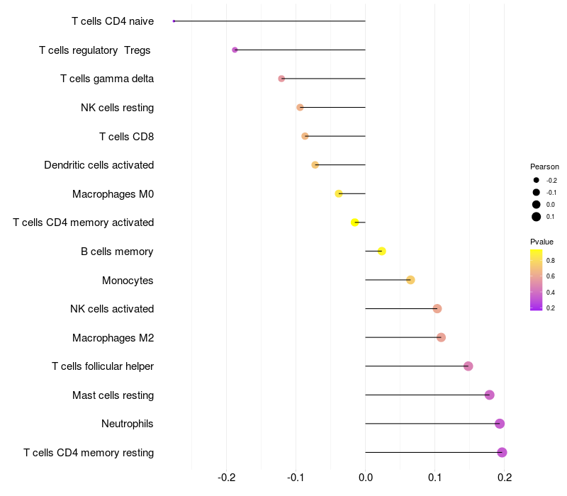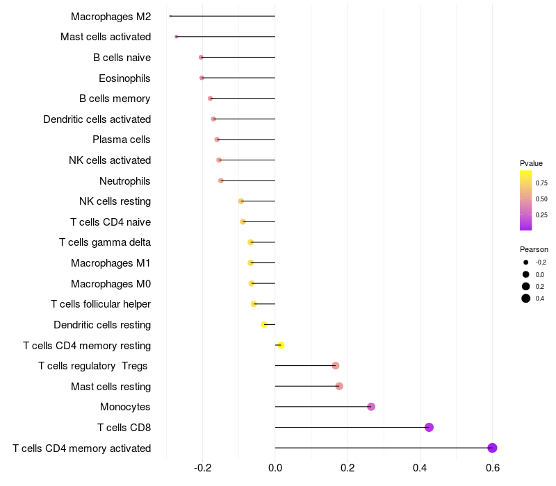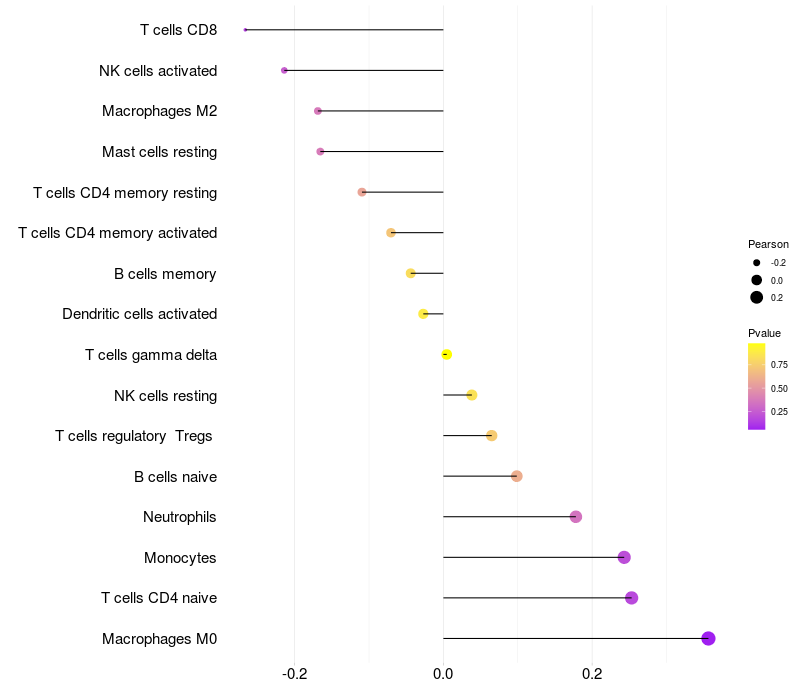 Lollipop of TEK expression and immune infiltrating cell level correlation result in HTLV1+ samples