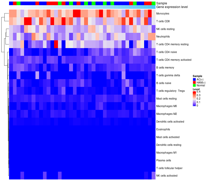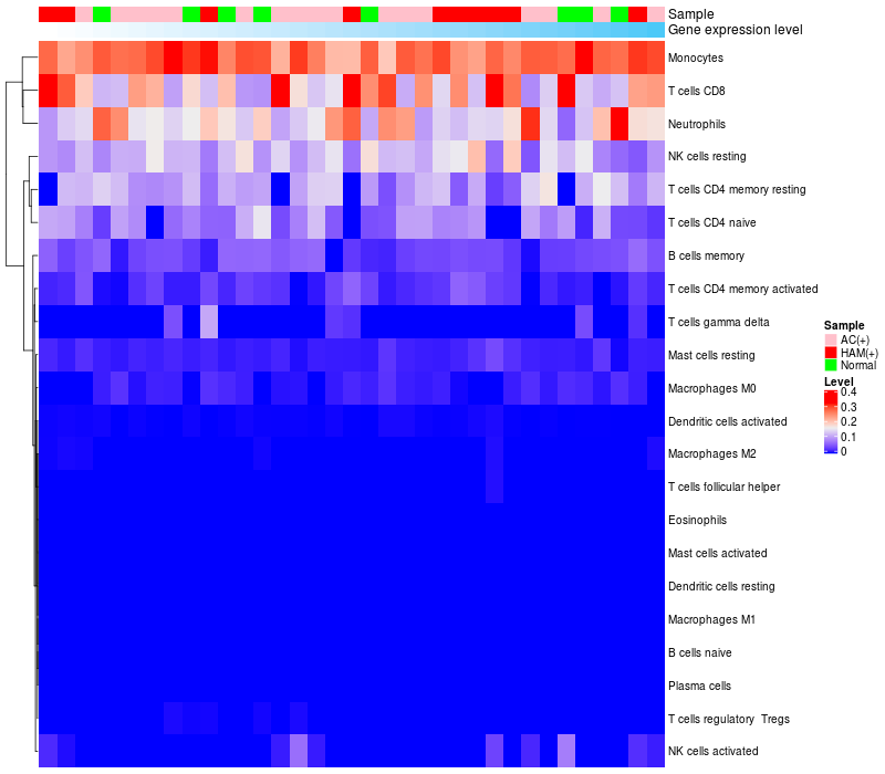 Normal (8), Asymptomatic carriers (HTLV1+)(17), HTLV-1-associated myelopathy (HTLV1+)(10) |