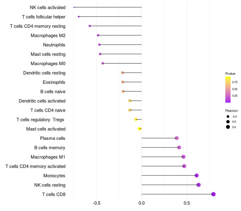 Lollipop of TEKT3 expression and immune infiltrating cell level correlation result in HBV+ Chronic HBV (CHB) infection samples