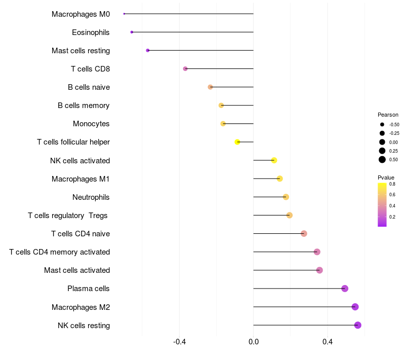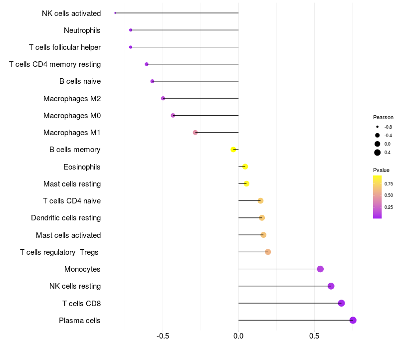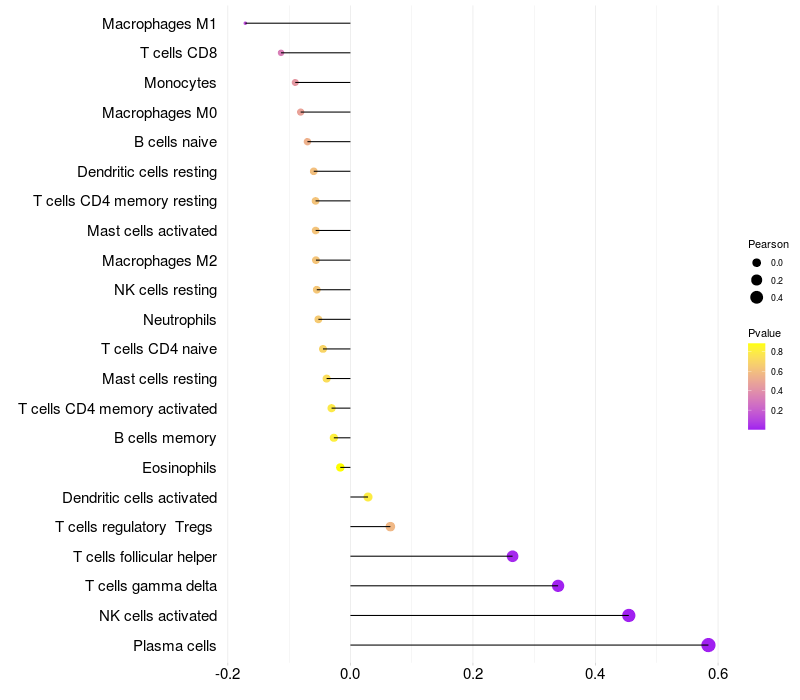 Lollipop of TEKT3 expression and immune infiltrating cell level correlation result in HBV+ Liver cirrhosis samples