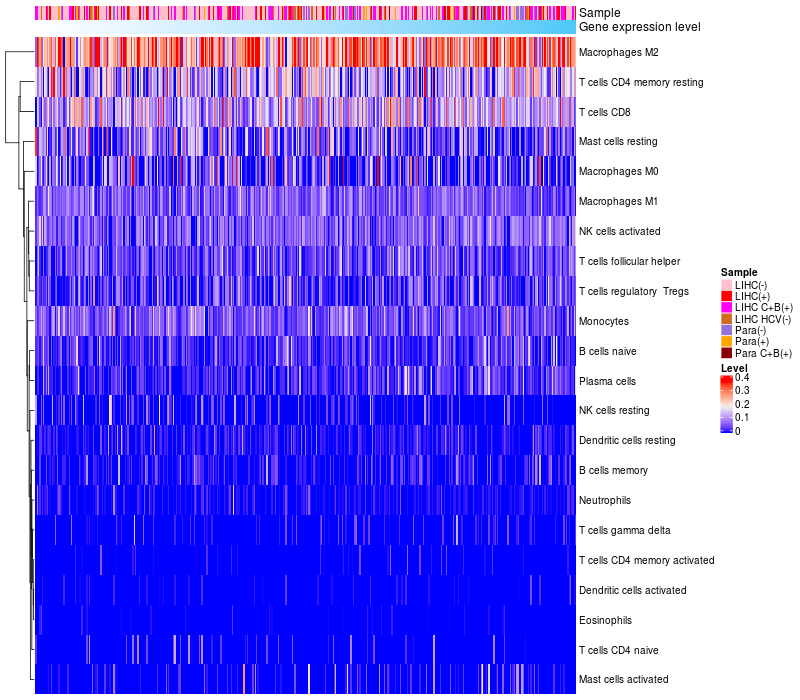 Liver hepatocellular carcinoma HCV (HBV+)(86), Liver hepatocellular carcinoma HCV (HBV-)(19), Liver hepatocellular carcinoma (HBV+)(209), Liver hepatocellular carcinoma (HBV+)(60), Paracancerous HCV (HBV+)(4), Paracancerous (HBV-)(28), Paracancerous (HBV+)(18) |