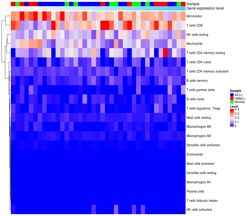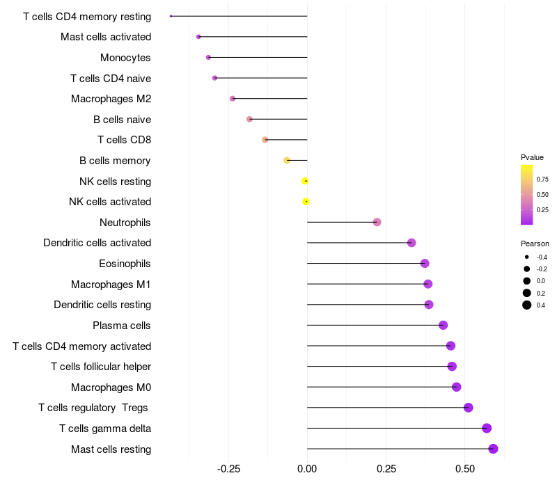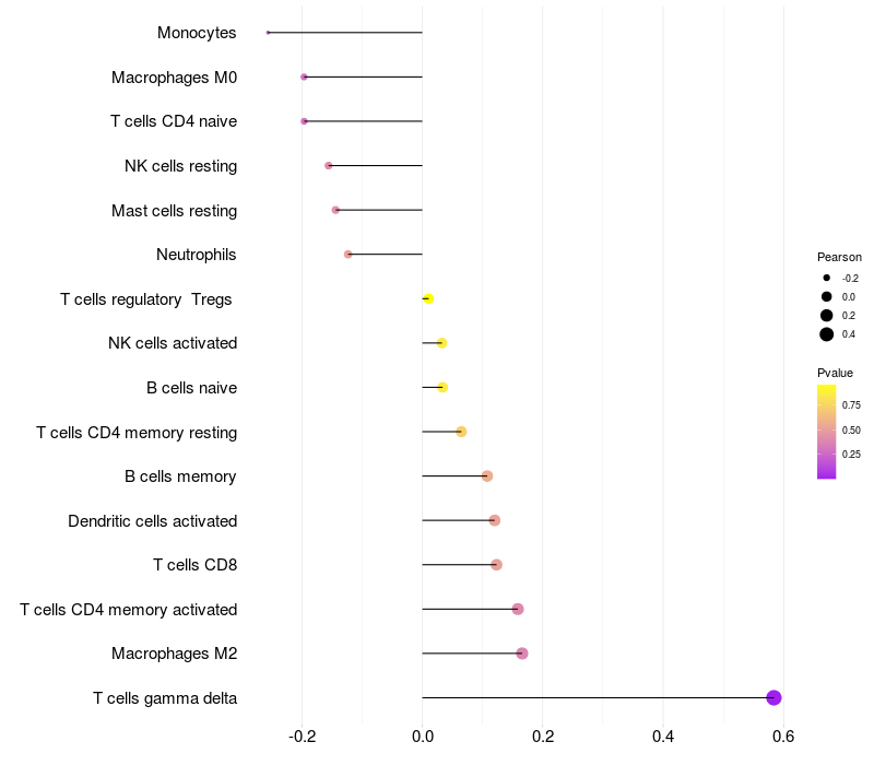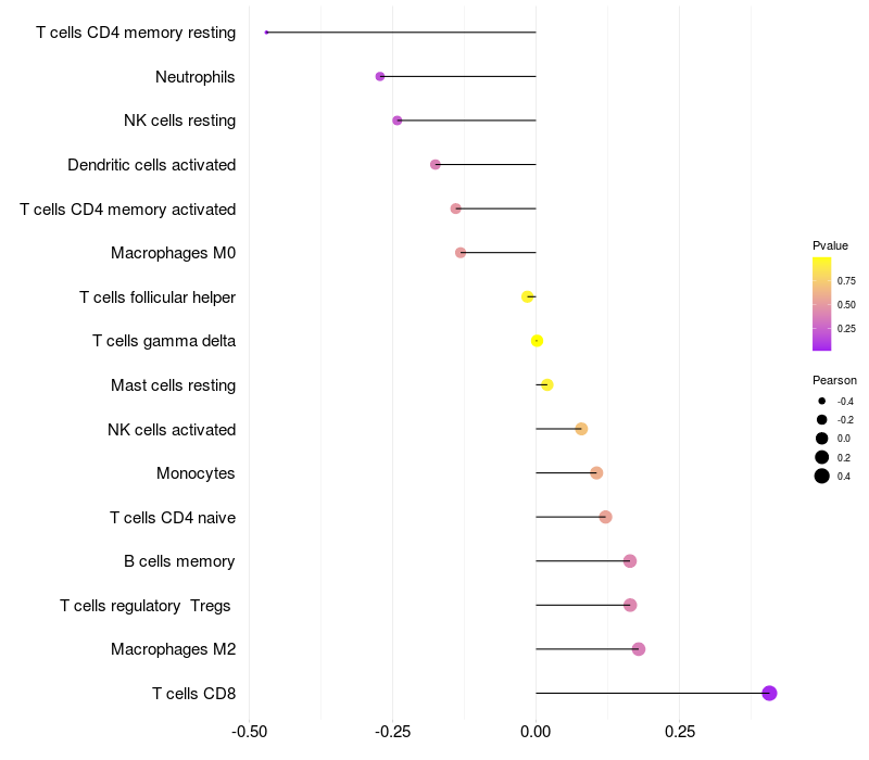 Lollipop of TERF2IP expression and immune infiltrating cell level correlation result in HTLV1+ samples