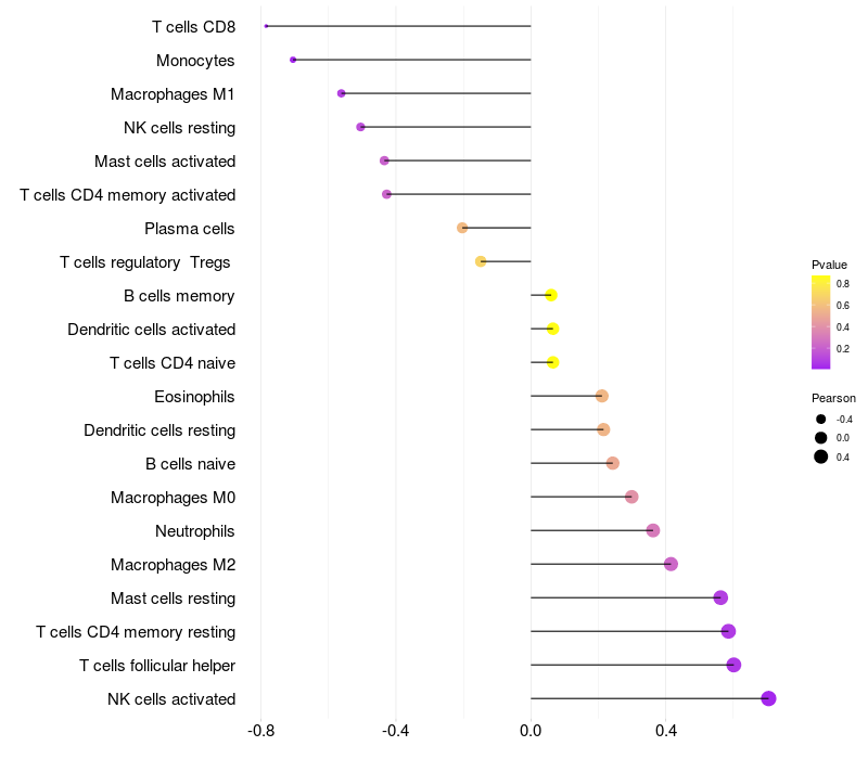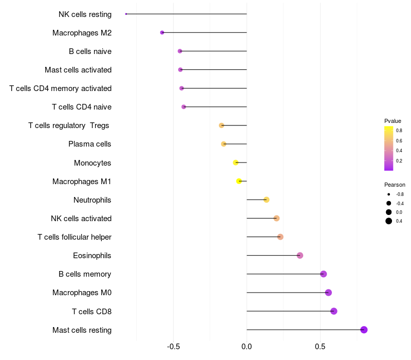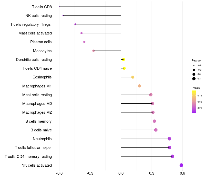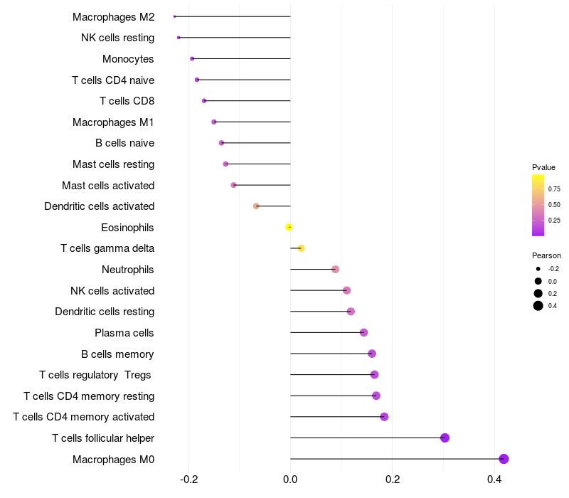 Lollipop of TEX10 expression and immune infiltrating cell level correlation result in HBV+ Liver cirrhosis samples