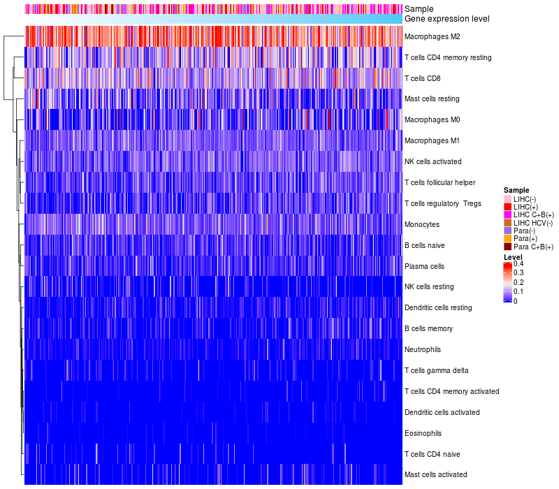 Liver hepatocellular carcinoma HCV (HBV+)(86), Liver hepatocellular carcinoma HCV (HBV-)(19), Liver hepatocellular carcinoma (HBV+)(209), Liver hepatocellular carcinoma (HBV+)(60), Paracancerous HCV (HBV+)(4), Paracancerous (HBV-)(28), Paracancerous (HBV+)(18) |