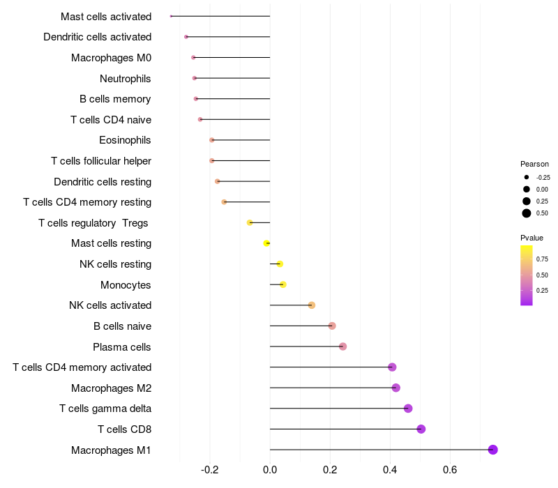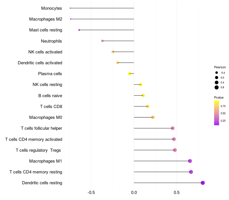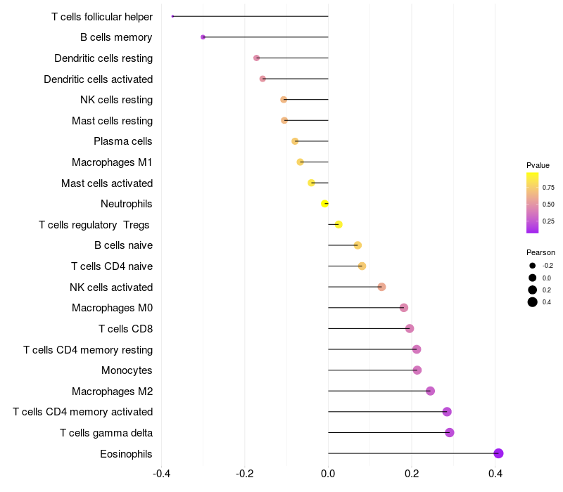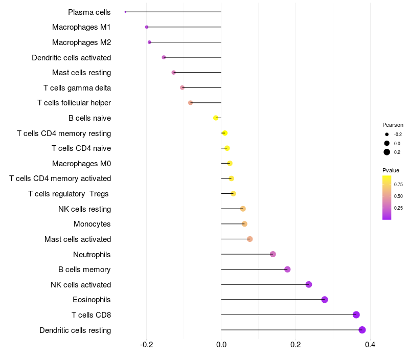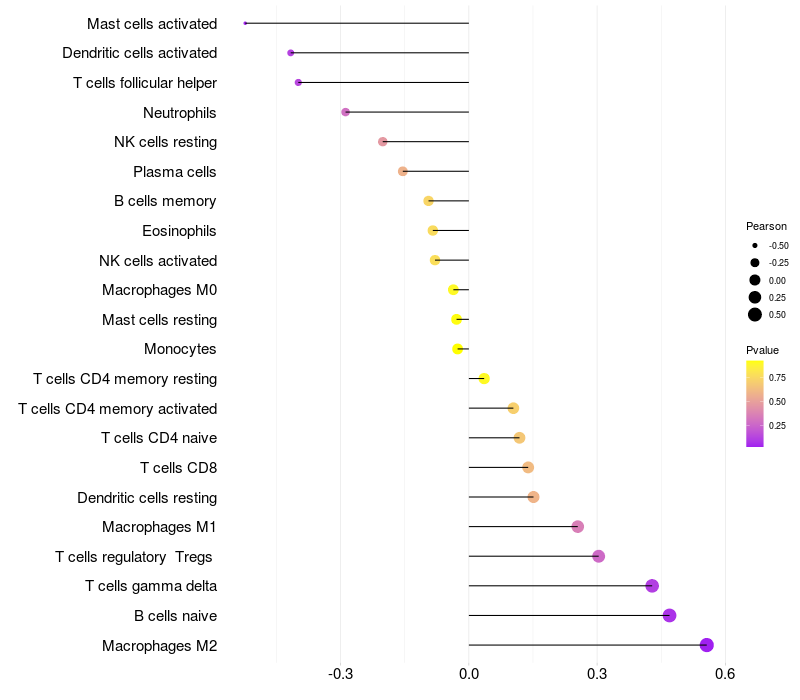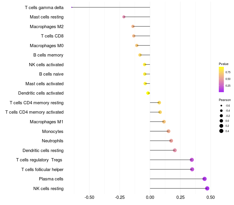 Lollipop of TEX13B expression and immune infiltrating cell level correlation result in HPV+ samples
