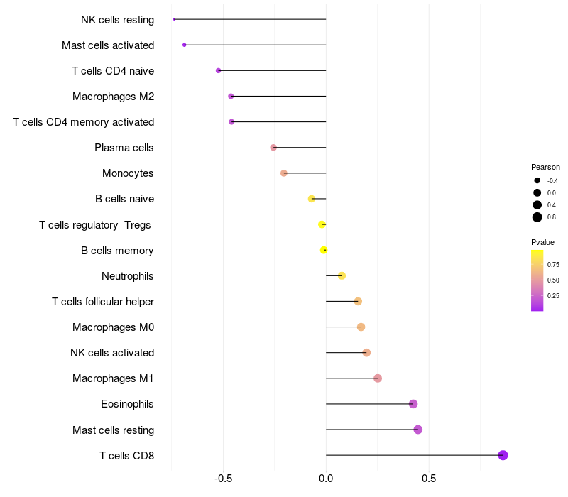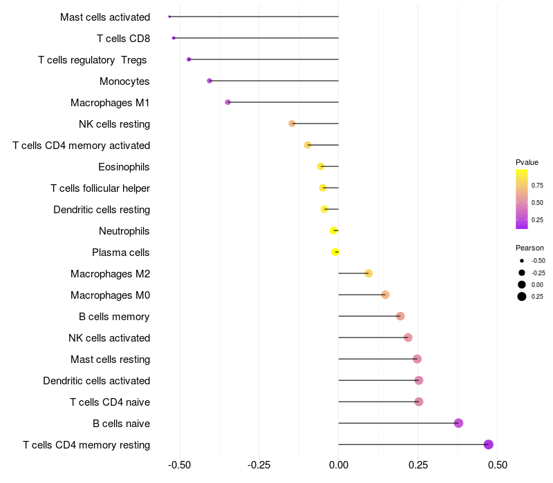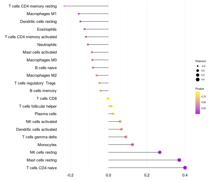 Lollipop of TEX264 expression and immune infiltrating cell level correlation result in HBV+ Chronic HBV (CHB) infection samples