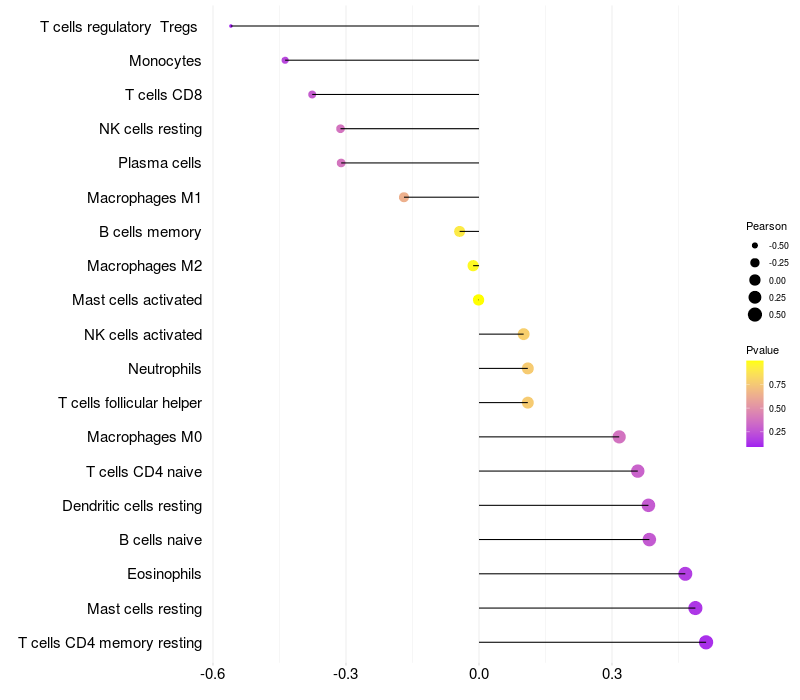 Lollipop of TEX264 expression and immune infiltrating cell level correlation result in HBV+ Liver cirrhosis samples