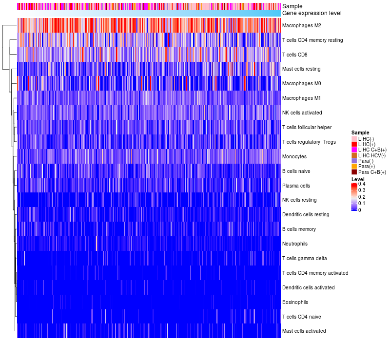 Liver hepatocellular carcinoma HCV (HBV+)(86), Liver hepatocellular carcinoma HCV (HBV-)(19), Liver hepatocellular carcinoma (HBV+)(209), Liver hepatocellular carcinoma (HBV+)(60), Paracancerous HCV (HBV+)(4), Paracancerous (HBV-)(28), Paracancerous (HBV+)(18) |