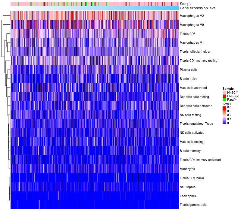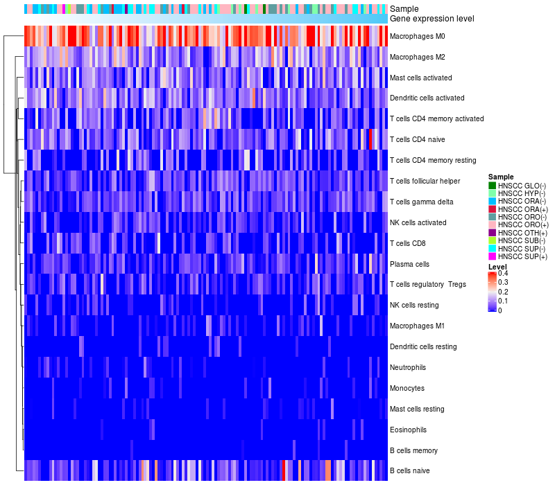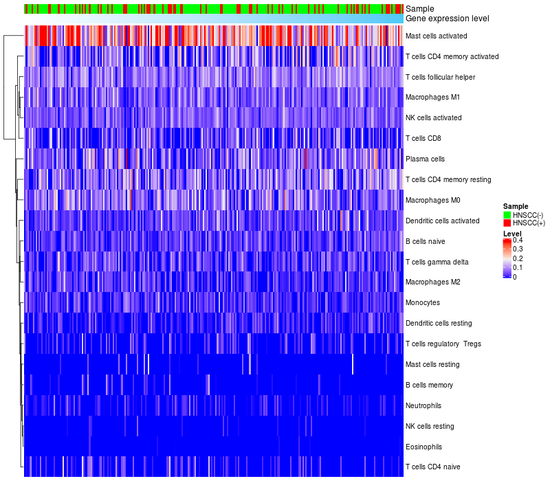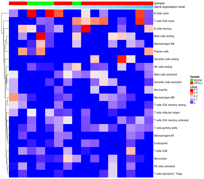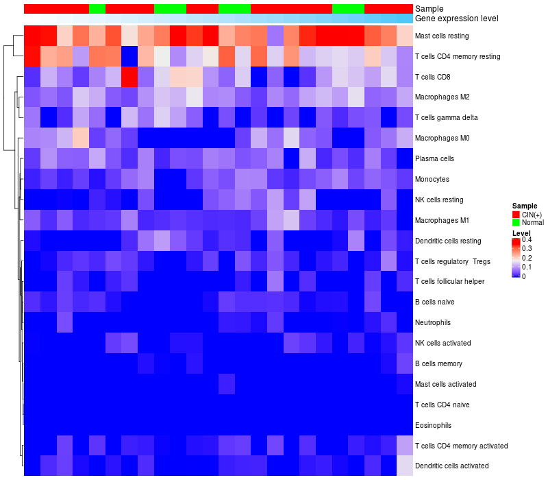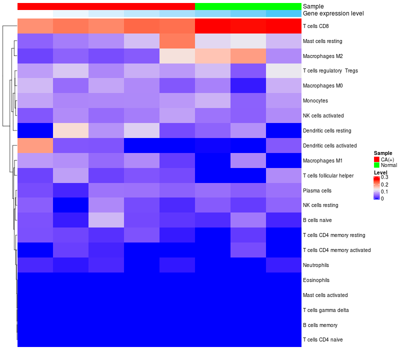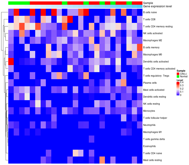 • Left: Heatmap of target gene expression and the level of various types of immune cells (cell type fractions) in all samples based on CIBERSORT method.