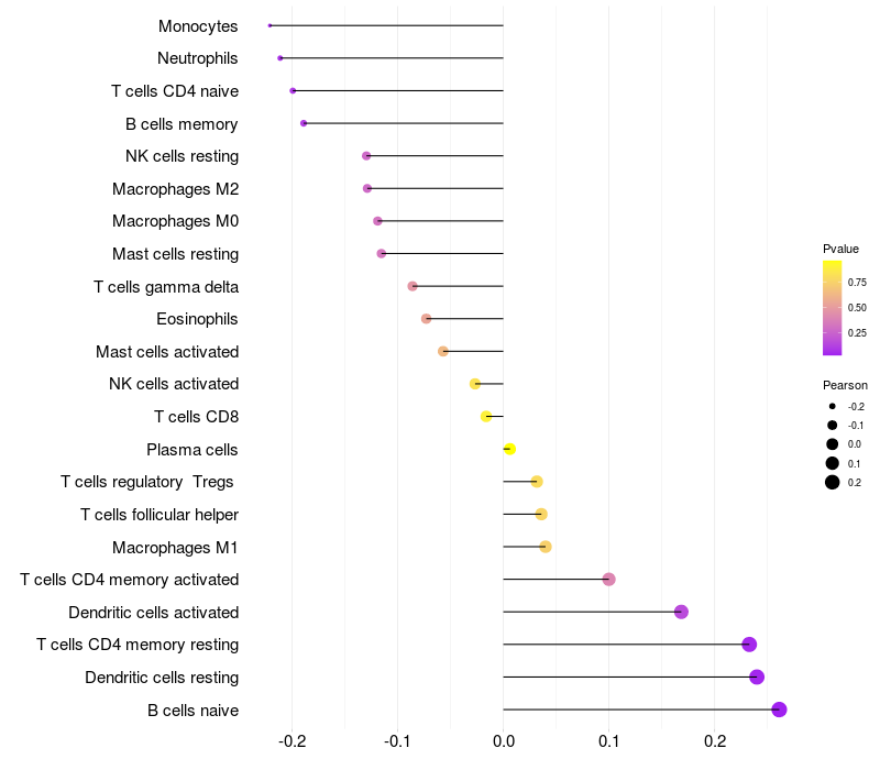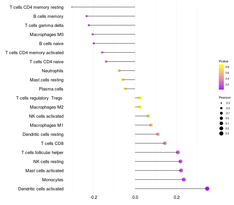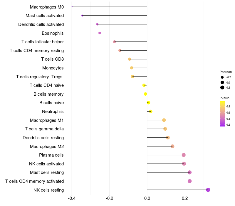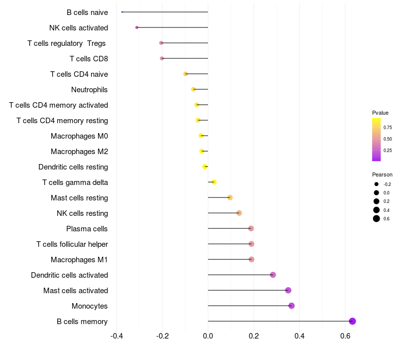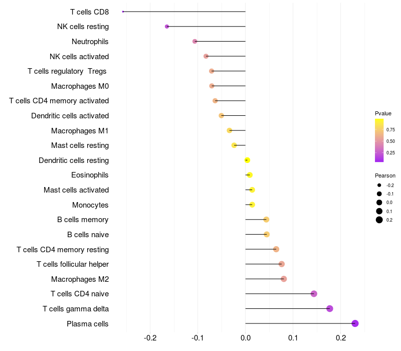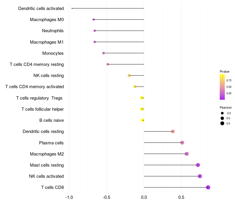 • Right: Correlation of target gene expression and the level of various types of immune cells in virus positive samples (Pearson Correlation Coefficient).