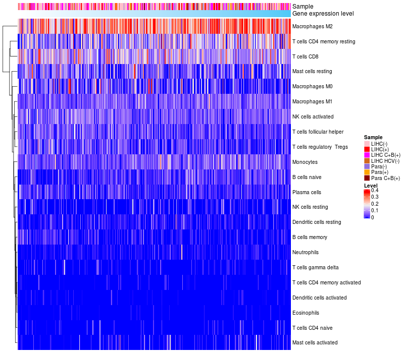 Liver hepatocellular carcinoma HCV (HBV+)(86), Liver hepatocellular carcinoma HCV (HBV-)(19), Liver hepatocellular carcinoma (HBV+)(209), Liver hepatocellular carcinoma (HBV+)(60), Paracancerous HCV (HBV+)(4), Paracancerous (HBV-)(28), Paracancerous (HBV+)(18) |