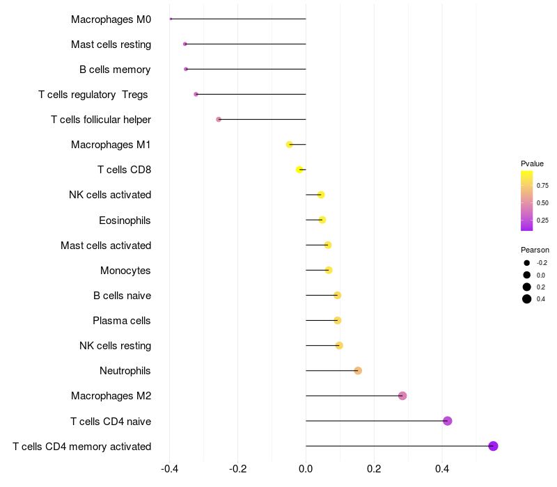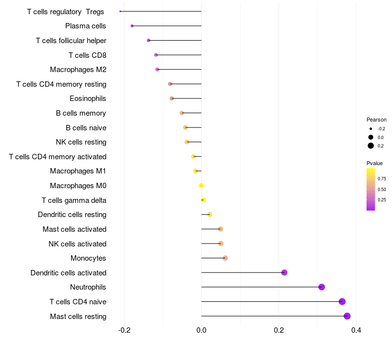 Lollipop of THAP10 expression and immune infiltrating cell level correlation result in HBV+ Liver cirrhosis samples