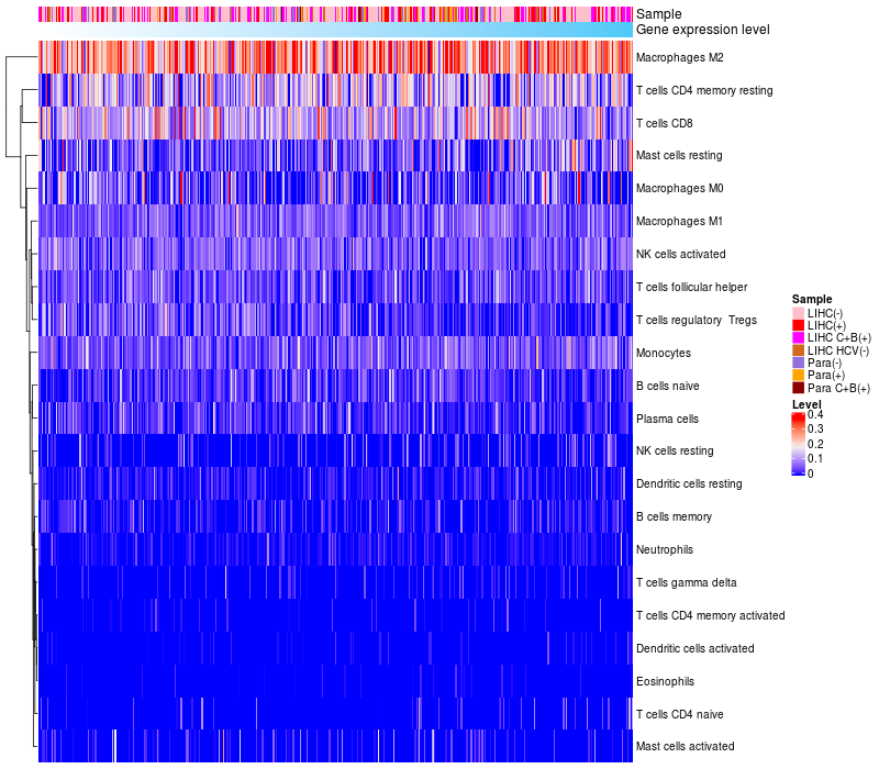 Liver hepatocellular carcinoma HCV (HBV+)(86), Liver hepatocellular carcinoma HCV (HBV-)(19), Liver hepatocellular carcinoma (HBV+)(209), Liver hepatocellular carcinoma (HBV+)(60), Paracancerous HCV (HBV+)(4), Paracancerous (HBV-)(28), Paracancerous (HBV+)(18) |