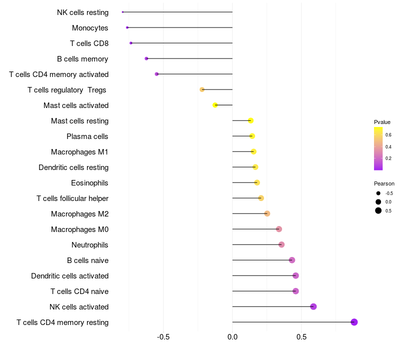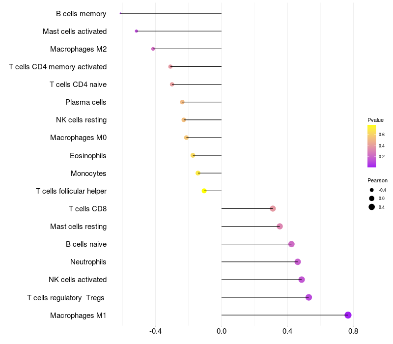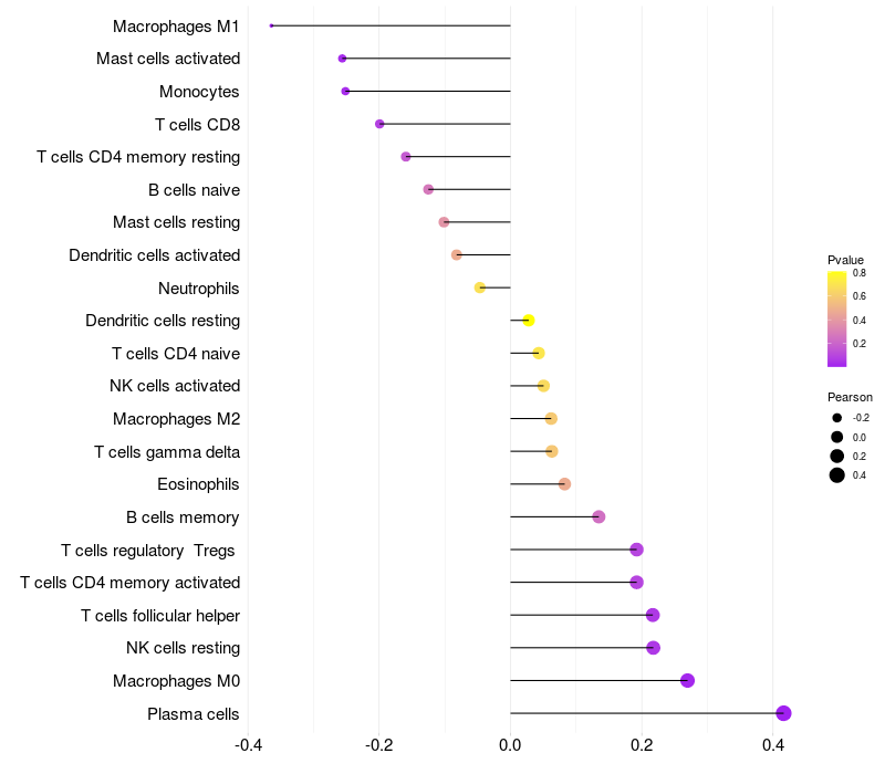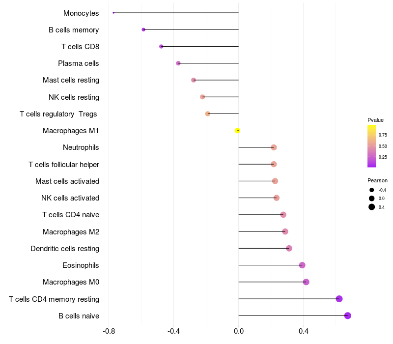 Lollipop of THAP8 expression and immune infiltrating cell level correlation result in HBV+ Chronic HBV (CHB) infection samples