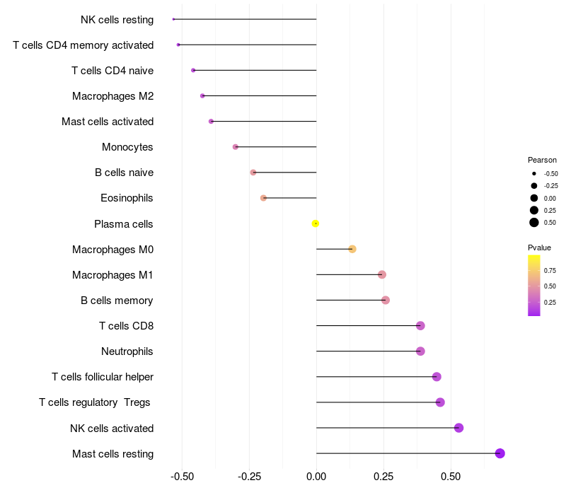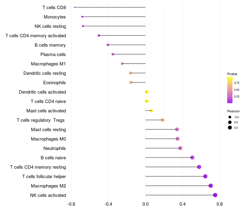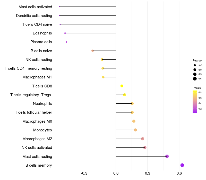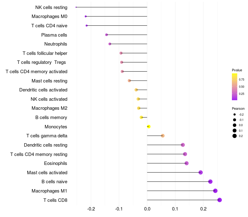Lollipop of THRAP3 expression and immune infiltrating cell level correlation result in HBV+ Liver cirrhosis samples