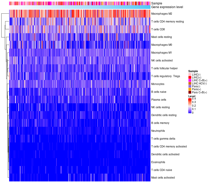 Liver hepatocellular carcinoma HCV (HBV+)(86), Liver hepatocellular carcinoma HCV (HBV-)(19), Liver hepatocellular carcinoma (HBV+)(209), Liver hepatocellular carcinoma (HBV+)(60), Paracancerous HCV (HBV+)(4), Paracancerous (HBV-)(28), Paracancerous (HBV+)(18) |