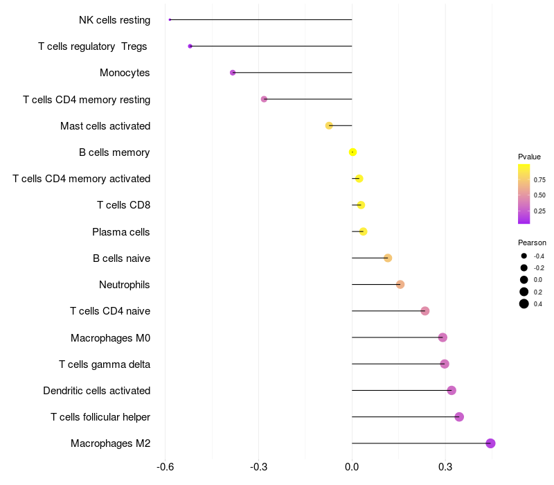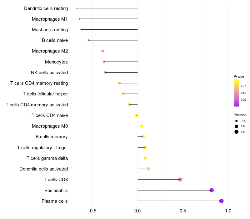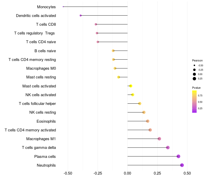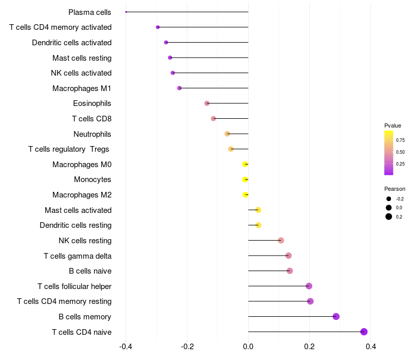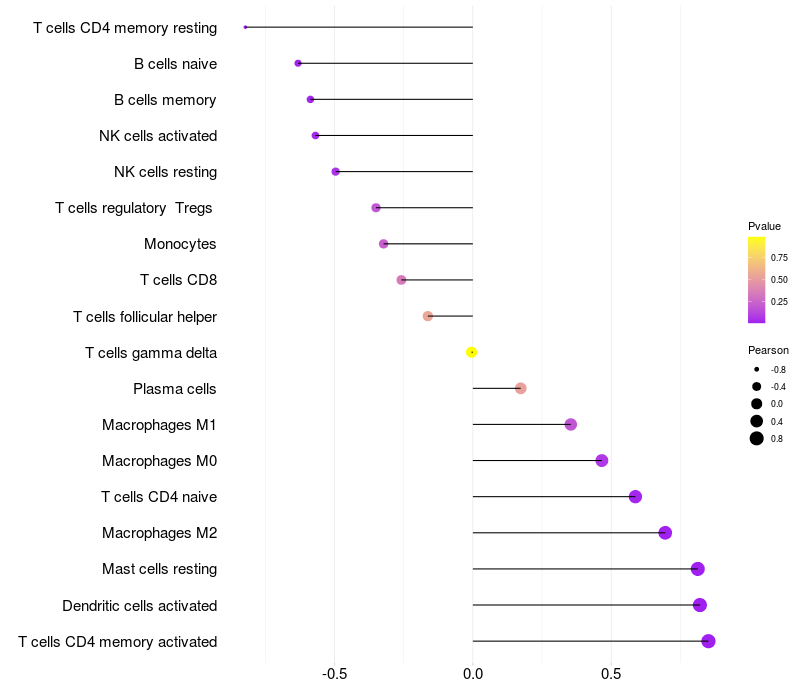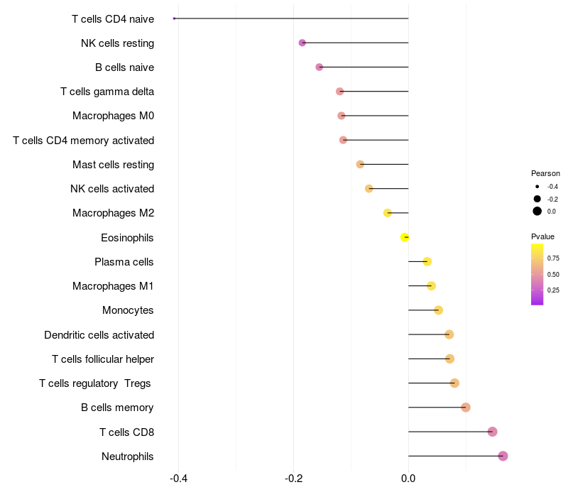 Lollipop of THSD4 expression and immune infiltrating cell level correlation result in EBV+ samples