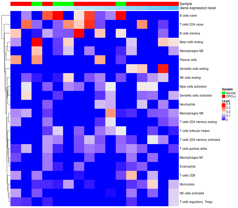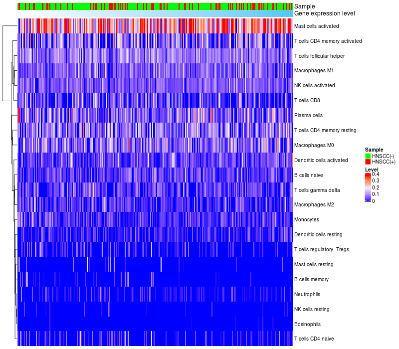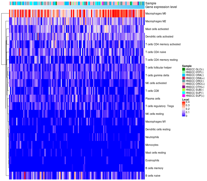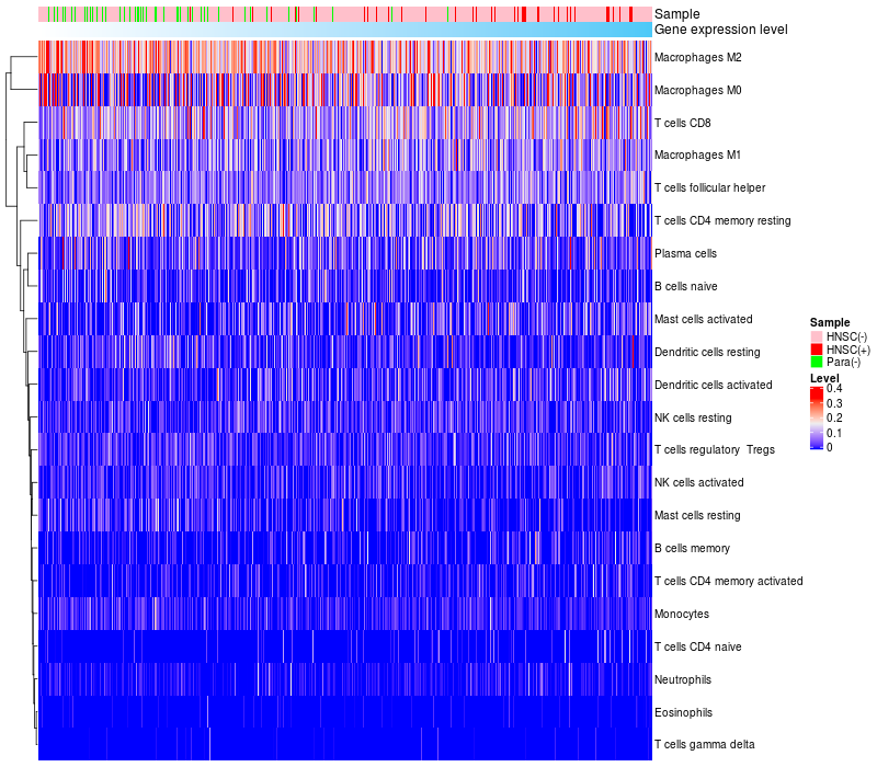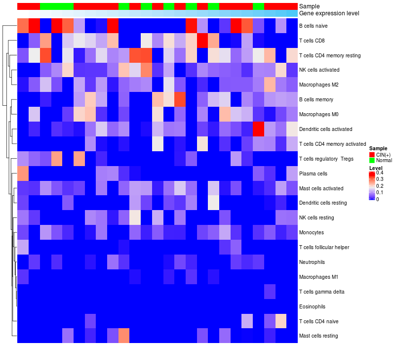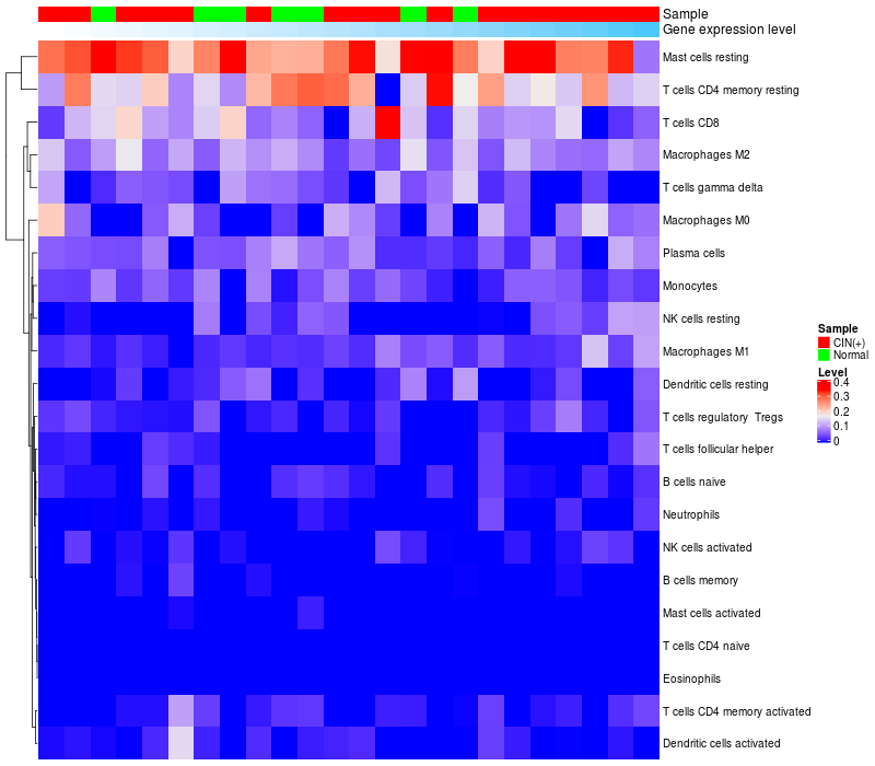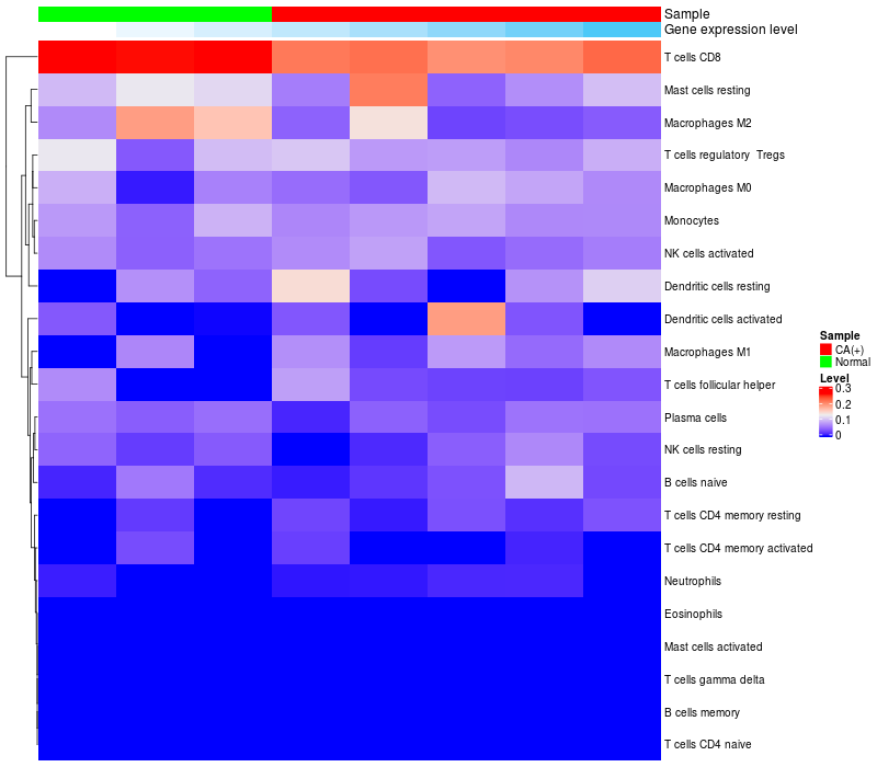 • Left: Heatmap of target gene expression and the level of various types of immune cells (cell type fractions) in all samples based on CIBERSORT method.