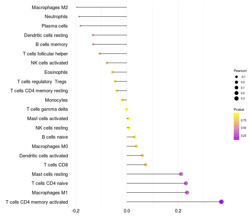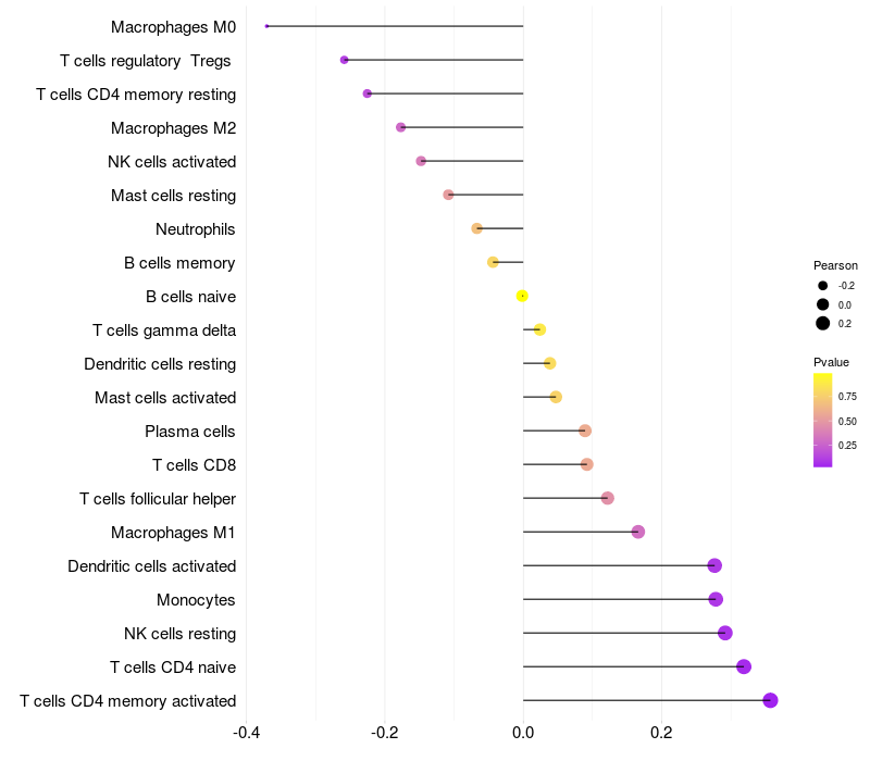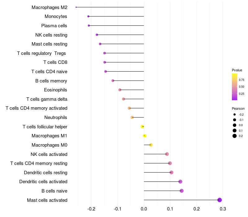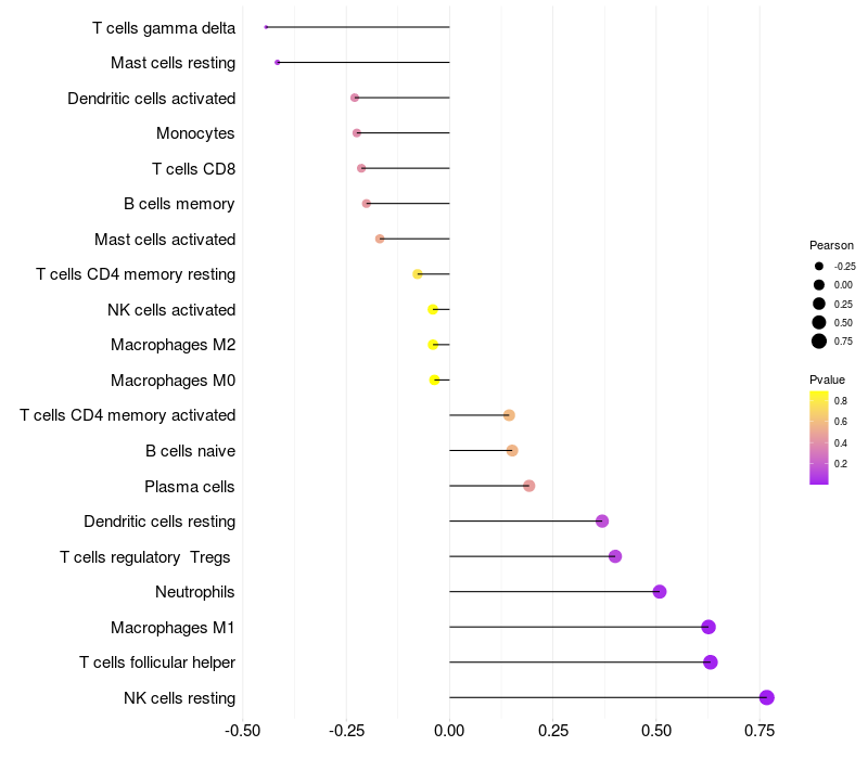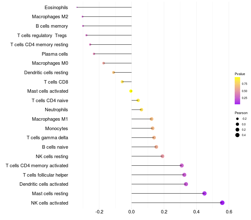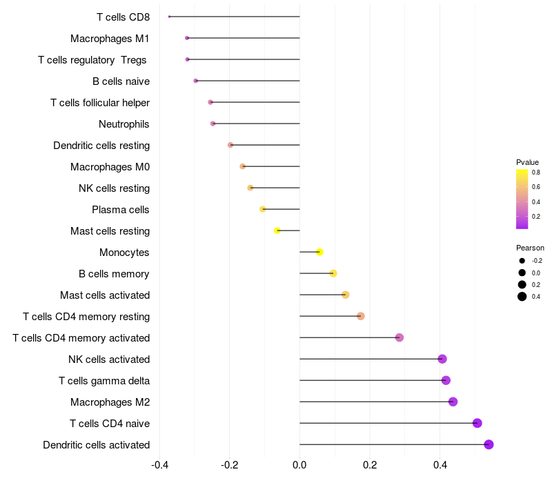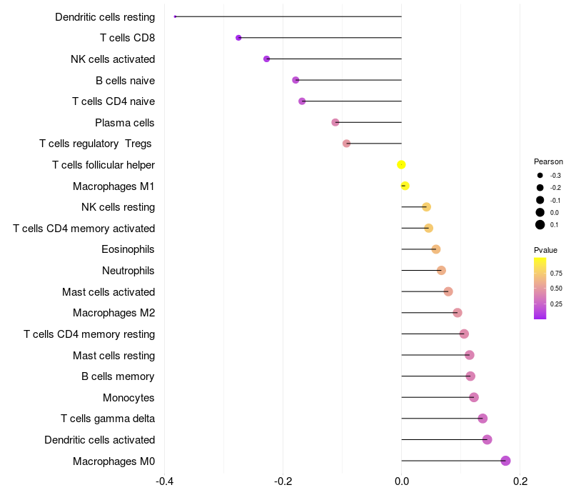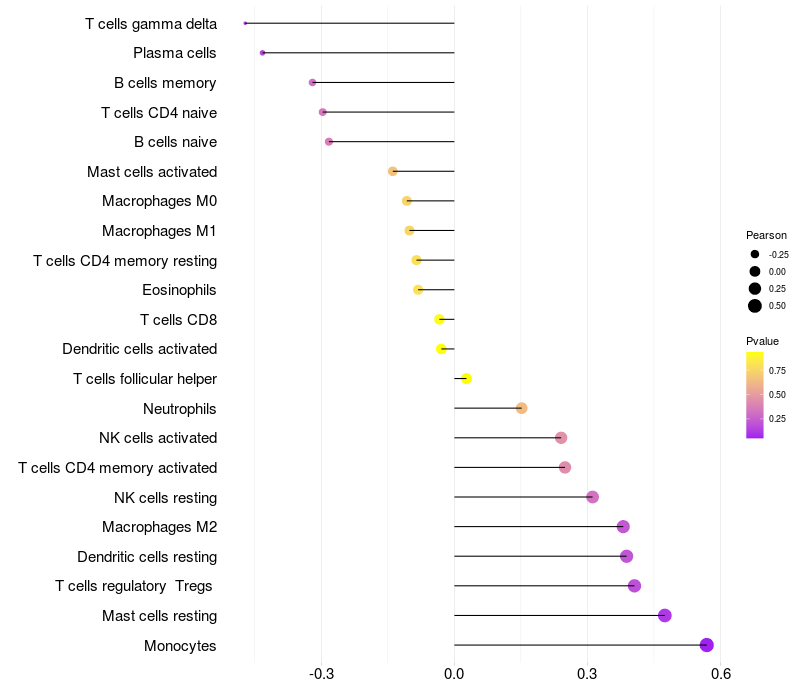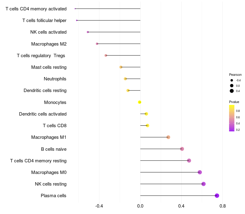 • Right: Correlation of target gene expression and the level of various types of immune cells in virus positive samples (Pearson Correlation Coefficient).