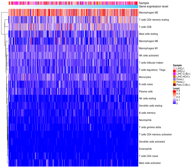 Liver hepatocellular carcinoma HCV (HBV+)(86), Liver hepatocellular carcinoma HCV (HBV-)(19), Liver hepatocellular carcinoma (HBV+)(209), Liver hepatocellular carcinoma (HBV+)(60), Paracancerous HCV (HBV+)(4), Paracancerous (HBV-)(28), Paracancerous (HBV+)(18) |
